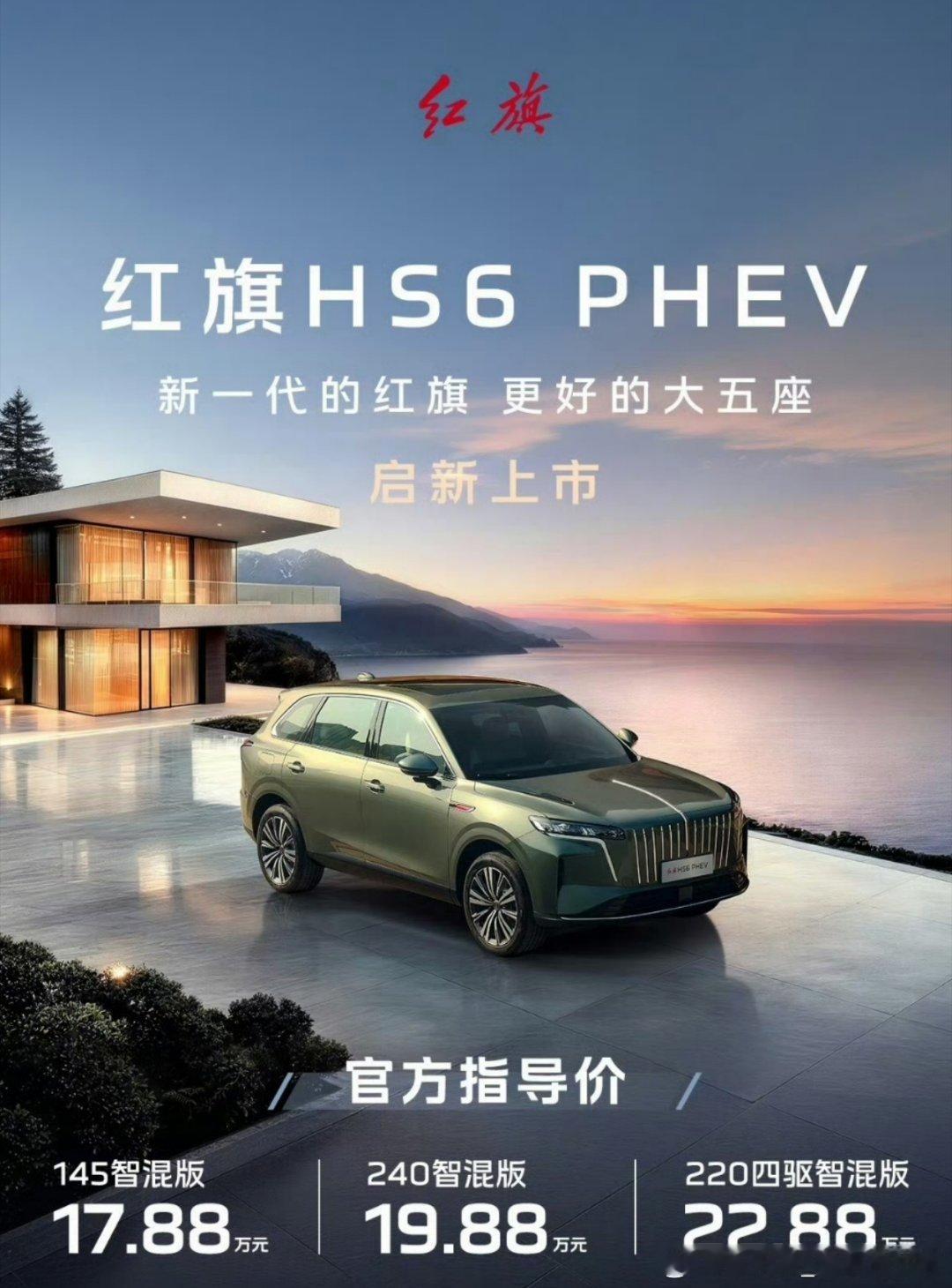 红旗HS6 PHEV上市17.88万元起的红旗HS6,作为一款中大型插混SUV,车身尺寸为4925/1970/1740mm,轴距2925mm。这个价格还是很有竞争力的,而且它还配备了中控双联屏设计,很不错、值得拥有新车