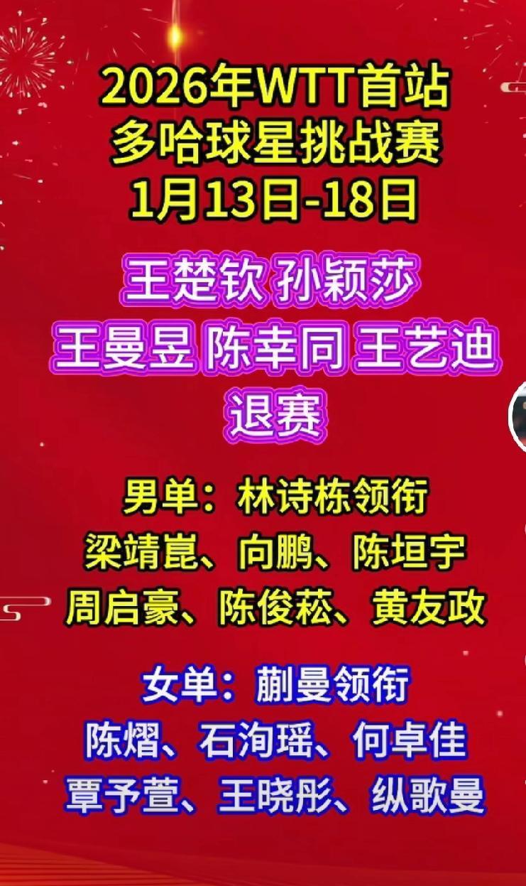孙颖莎、王楚钦退赛,林诗栋、蒯曼领衔出战,2026年开年乒乓球第一赛(多哈球星挑战赛)参赛名单,见图。 惹人注目的是,几个头部选手都选择了退赛,特别是女单,大部分是年轻选手了。 球迷观点:这样的安排,非常合理,多给年轻选手锻炼的机会,积累大赛经验,让他们在实战中去打磨,找出自己的短板和不足,锤炼自己的意志力和爆发力,尽早担当大任,永葆国乒本色。