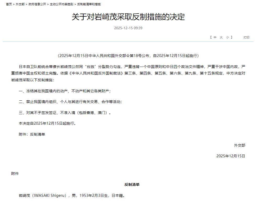 日退役军官,勾结台独分子,外交部发公告,必须办他! 中国再出重拳,这次要暴击日本军国主义投机分子和台独分子,斩断他们分裂中国的阴谋。日本前自卫队前统合幕僚长——岩崎茂,这次撞到枪口上了。他竟然被台湾赖清德当局聘请为“政务顾问”。士可忍,孰不可忍!必须帮他! 冻结其在华所有财产,禁止国内任何组织和个人与其进行有关交易、合作等,不予签发签证,禁止入境。中国的红线一步都不能越,这次就先拿你岩崎茂来杀鸡儆猴。具体什么情况?不要走开,我们今天一起来关注。 综合环球时报等媒体消息,15号,外交部宣布对日本自卫队前统合幕僚长岩崎茂采取反制措施。因为岩崎茂公然同“台独”分裂势力勾连,严重违背一个中国原则和中日四个政治文件精神,严重干涉中国内政,严重损害中国主权和领土完整。依据《中华人民共和国反外国制裁法》相关条款,对其实施冻结财产,禁止交易,不准入境等三重制裁。 为什么我们这次要狠狠地帮他。因为岩崎茂他不是一个简单的人,首先他是典型的日本军国主义者,极度反华。在他担任统合幕僚长期间就公然宣称:“希望增强在西南地区、尤其是尖阁诸岛周边的姿态。”他口中所称的尖阁诸岛,就是我们的钓鱼岛。2021年他又公开发文,鼓吹台湾有事就等于日本有事,推动修改新版《国家安全保障战略》。 第二,岩崎茂职业生涯一直在军界,他退休前担任的统合幕僚长,是日本自卫队最高的指挥官,相当于正常国家的总参谋长。退休后,仍然是日本自卫队的顾问,在军界的影响力不容小觑。 第三,岩崎茂被聘请为台湾的“政务顾问”,是兼职,并且没有工资,看似正常。但是日本侵华的罪恶历史,在时刻提醒着我们,绝对不能放松警惕。日本在发动侵华战争之前,就往各地军阀中安排了不少的顾问。解放战争时期,蒋介石又聘请了曾经的“日本中国派遣军”总司令、甲级战犯冈村宁次,充当顾问,帮助老蒋打内战。 所以,我们必须帮他!有朋友可能会问,那他在咱中国有资产吗?有的,啊……那绝对是有的,综合相关媒体报道,不动产方面,岩崎茂在上海有一套价值约2000万的房产。金融资产方面,在华银行也有资金并持有某科技公司的股份。商业利益上,岩崎茂长期充当二道贩子,倒卖二手雷达、无人机等零部件。 所以,咱的制裁不仅仅是政治态度,而是实打实地要办他!并且要一办到底!至于台独分子。相信,见面的日子不远了,你们很快也就要被收拾了!大家说呢。
