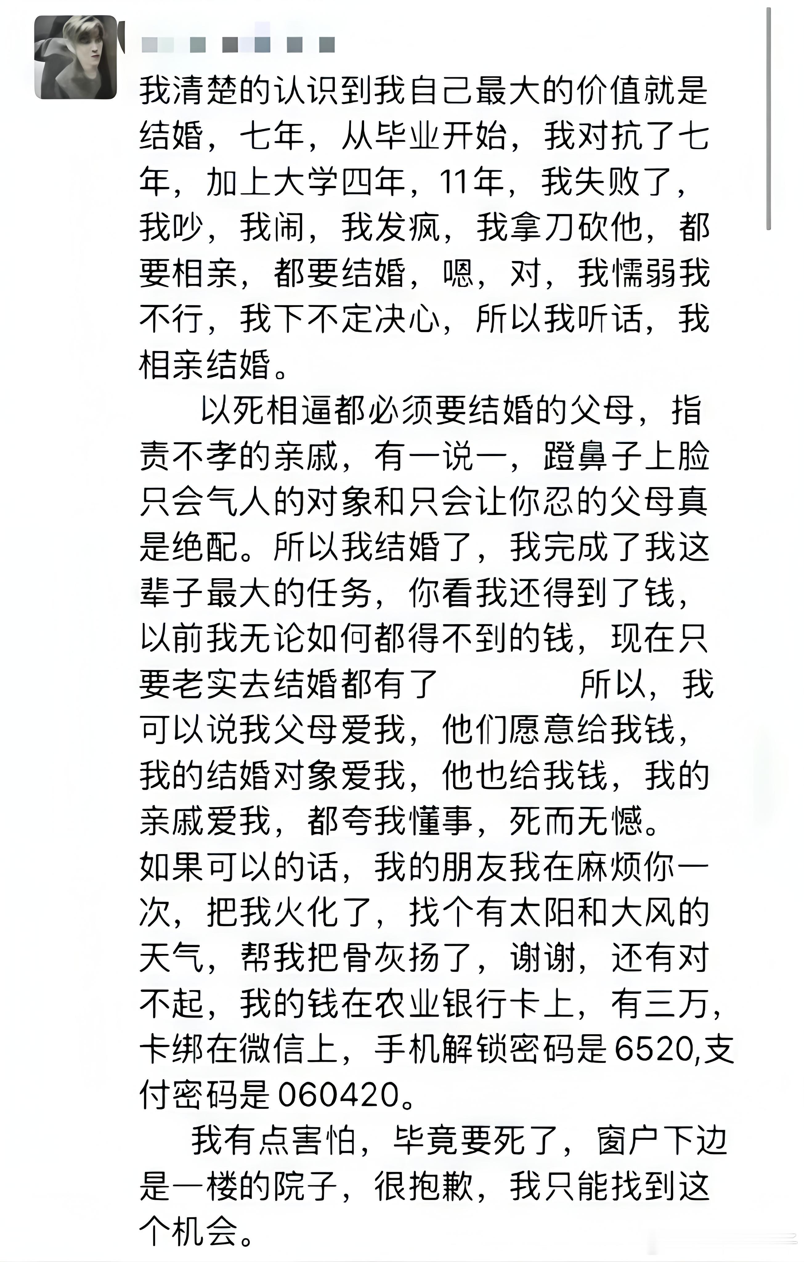 女教师新婚坠亡一楼业主要求赔偿 中国新闻周刊报道的内容:女教师在婚礼当天以换衣服为由,支开所有人后从楼上跳下。图二朋友圈疑似遗言。坠入一楼院内,业主要求赔偿,女方家人认为嫁出去了,把责任推给新郎,新郎认为没娶到,责任在女方。