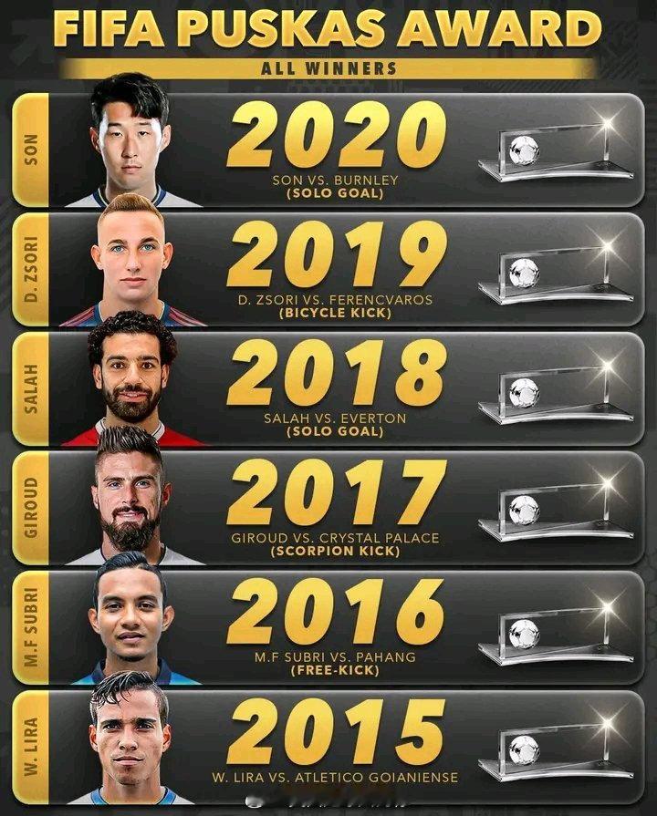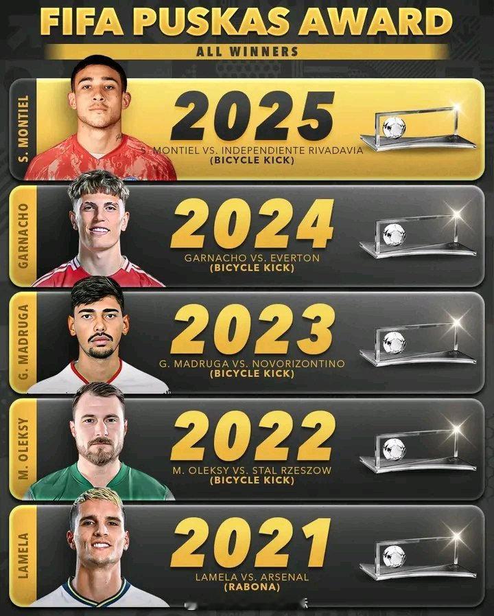 【历年金球】2015-2025,最近11年国际足联普斯卡什奖的得奖金球:大吉鲁的蝎子摆尾,萨拉赫的个人单挑、拉梅拉的北伦敦插花脚、孙兴慜的半场单骑闯关,加纳乔的超级倒钩。。。。。大家还记得吗?蒙铁尔倒勾当选普斯卡什奖 2025国际足联年度最佳出炉