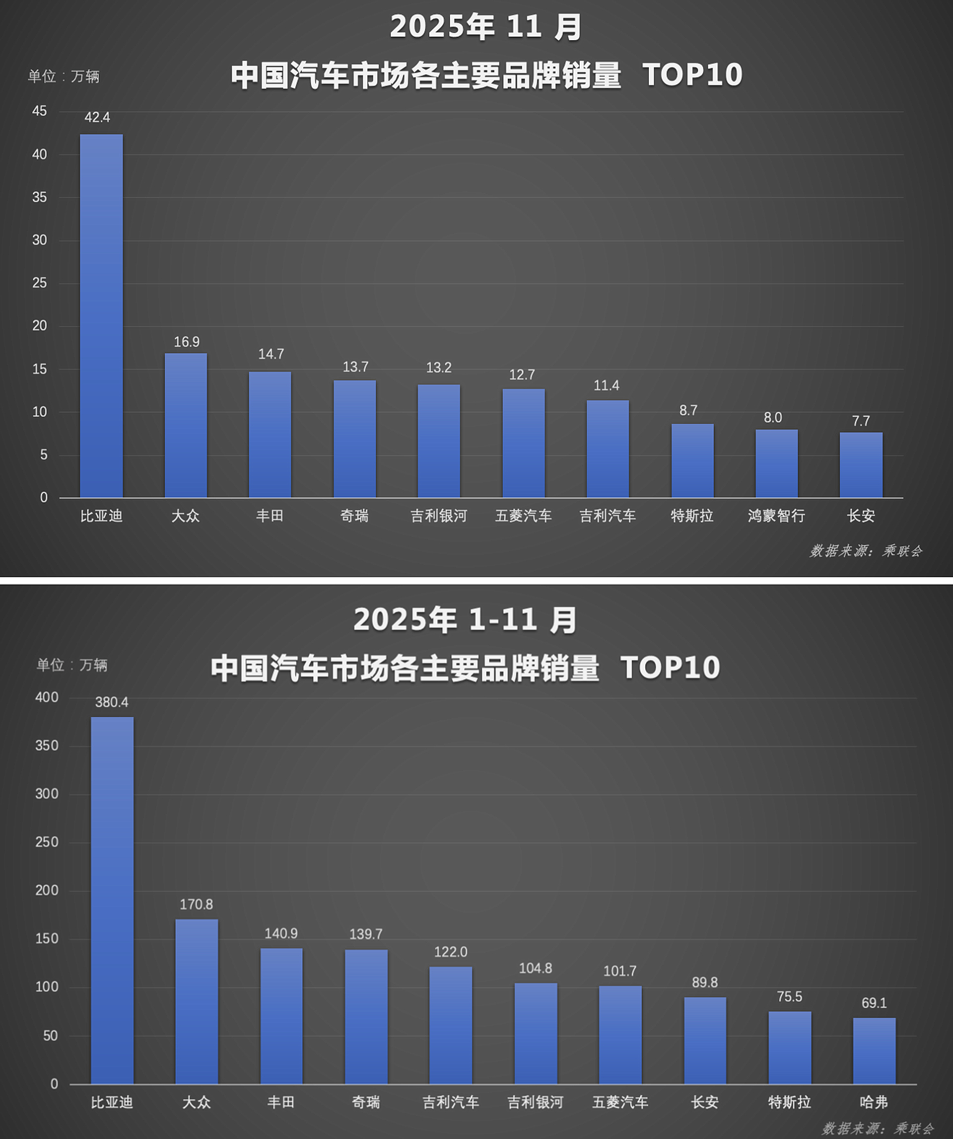 在王朝、海洋双网保持稳定推进的前提下,比亚迪在高端化冲量车型上的发力尤为显著。得益于钛7、腾势N8L等新品的上市,方程豹、腾势分别以37405辆、13255辆的单月成绩收官。其中方程豹 钛7更是一举拿下混动SUV&方盒子双冠,成为年底现象级车型。在海外市场,比亚迪11月乘用车及皮卡车型单月销量达131661辆,同比上涨297%。1至11月海外累计销量超91万辆,超2024年全年两倍还多,全年突破百万大关已指日可待。