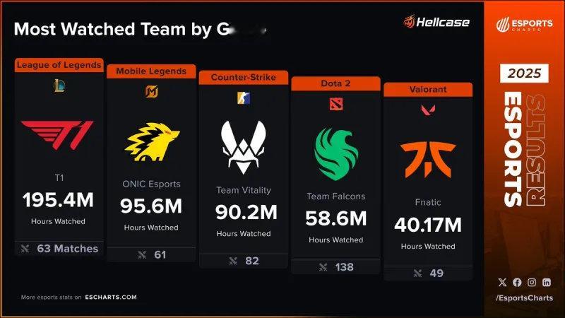 外媒近期统计了2025年各大电竞战队的总收视时长。T1战队以1.954亿小