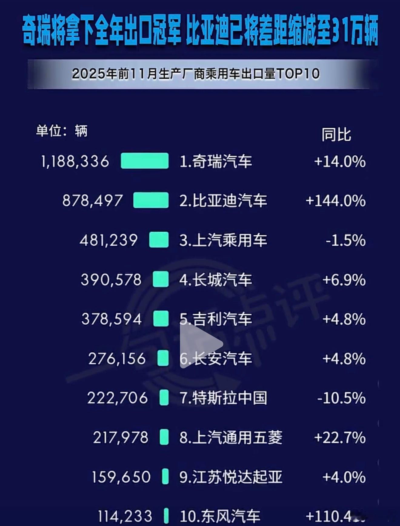 前几天发了一期视频谈“出海五大”,今天刷到最新的销量榜单。“出海五大”我去年第一次讲到,是一次马来西亚参观宝腾之后。今年是比亚迪出海大爆发的一年。随着比亚迪海外的当地产能进一步落地,随着产品线的投放更加合理(早期byd出海太押宝纯电,今年爆发和dmi的加入关系很大),明年比亚迪预计还会有好表现。上汽势头没前两年猛,在欧洲遭遇了特别针对上汽的超高关税待遇。欧洲是上汽出口最强的地方,所以这个打击是很大的。吉利今年出海,感觉是个调整的年份。之前很好卖的一些市场,现在在地缘冲突当中。银河出海相对比较晚,但今年进入的市场表现都比较好。领克极氪这样定位较高的品牌在海外速度天然是需要时间和耐心的。让外国人接受中国高端品牌,比说服自己人,肯定是更难的过程。奇瑞的打法天女散花,怎么灵活怎么快速怎么来。增速放缓,继续老大。现在奇瑞在海外的利润是远高于国内的。这恐怕也是很多中国优秀制造业以后的大趋势了。长城的出海是五大中比较有特色的。有一个日本汽车人跟我说,长城很像拥有克莱斯勒、Jeep、RAM的美系集团,产品打法很有特色。在喜欢小车、人口稠密、消费能力一般的东南亚,长城表现就相对一般。到了辽阔广袤的澳大利亚,来自大保定的产品线就特别吃香,销量在中国品牌中数一数二,当地口碑也在形成。今天一位国内资深投资人,说看了我最近在欧洲澳洲拍的长片,帮他验证了一些观点和投资选择。其中提到了海尔空调,我在德国、澳洲、菲律宾,最近都不断看到海尔的身影。有人可能会觉得奇怪,即使东风汽车这样在国内表现不突出的车企,怎么出海却进了前十,年出口整车 10 万+的台数。这里的关键问题是:国外的需求是油车为主还是电车为主?是经济实惠车为主还是高端大气为主?是网红气质自我满足为主还是居家过日子实用就好为主?是紧凑尺寸为主还是庞大体积为主?拥有多元动力、丰富车型选择、价格带覆盖纵深的大车企优势就显示出来了。况且这些大型车企深耕出海往往在十年以上,修炼了更丰富的经验和体系建设和海外的各方面的伙伴。如果你没做过欧规车型,没开发过右舵,第一次做,人才是个问题,投入是个考验,也需要交一些学费。