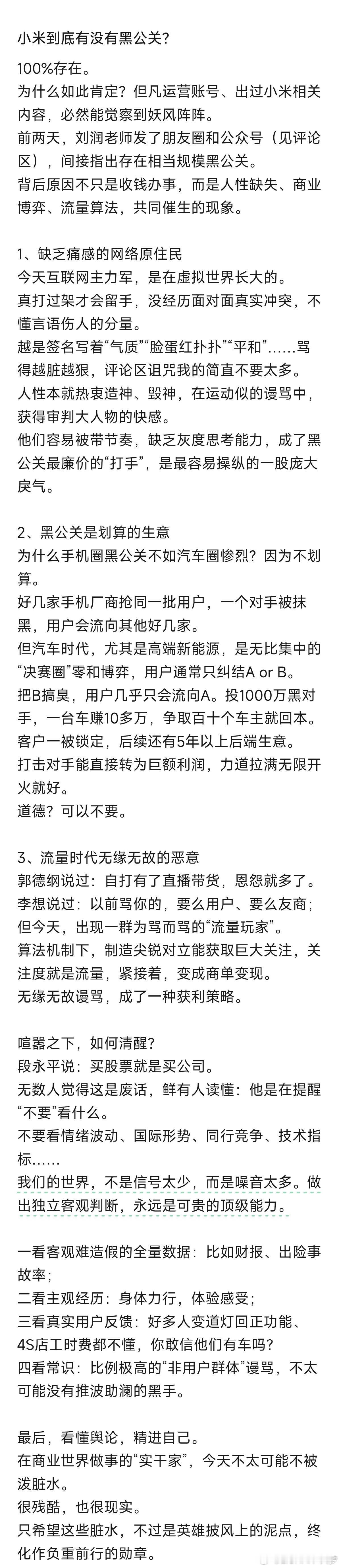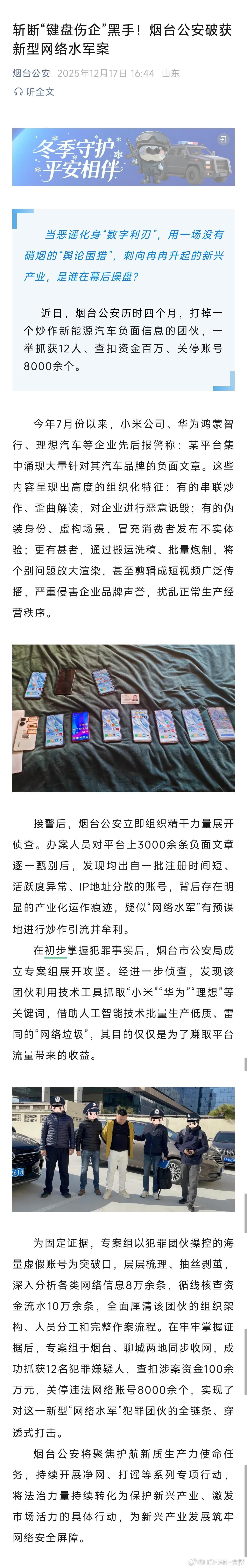 黑产操纵8000余个账号抹黑小米华为理想先说个好笑的,黑小米的水军居然用的也是小米手机,看来水军也是知道小米手机便宜好用耐用抗造…但魔幻的点也就是在这里,首先是这些人的所作所为就是违法行为,而且罔顾事实,明明自己可以分的清孰是孰非,却依旧出卖了自己的良心,最后只能锒铛入狱。从目前警方公布的信息来看,流水百万信息十万余条,这么算一条就大概十块。当然这只是最终端的环节,背后可能还有更大的利益链条,所以一定要查,最好把整个利益链条一锅端了。我一直想说的也是,国产新能源发展到现在非常不容易,国产汽车也就是在这两年重新赢得了消费者认可,比如比亚迪在技术的投入、小米在纽北的突破,再或者理想在产品定义与模式上的创新,都值得鼓励。如果我五年前我告诉你现在国产品牌会打败合资品牌,甚至还可以卖到50万、100万,你大概会觉得我疯了,但事实就这么发生了。所以希望类似这样打击网络水军的行动越多越好,给互联网多来一些正气,以正视听,这也是保护我们的国产新能源市场。最后作为普通消费者,我觉得我们能做的事就是,看清舆论、精进自己,不要总让被煽动情绪,成为了别人利用的工具。