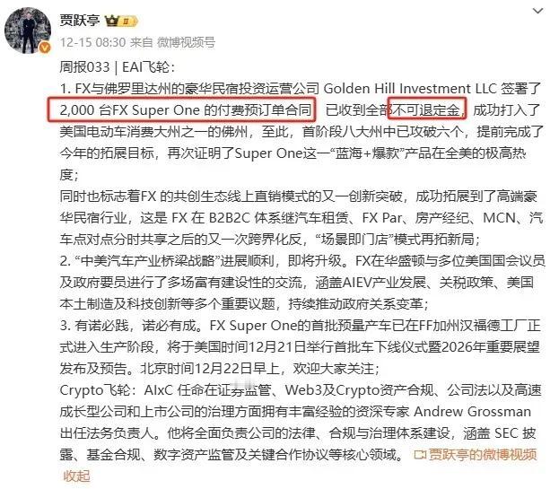 一把卖掉2000辆车,贾跃亭的法拉第旗下第二款车,再度传来好消息。这真得感谢长城老板魏建军的独到眼光,同贾跃亭合作的车型FX super one,最新斩获2000辆预付费订单,买方是佛州一家豪华民宿公司。贾跃亭透露已收到对方全额不可退定金,至于有多少没有说,不过推测定然比之前该车型一辆100美金的预付费要高的多。 更令人惊奇的是,贾跃亭还宣布造车事业的两个重大进展,一个是同长城合作的车型手握至少1.2万辆订单,证明了“中美汽车产业桥梁战略”进展顺利,而且还将打入更多市场。 另一个则是最重要的造车进展,空有订单在手无法交付,一切都还是镜花水月。贾跃亭表明super one首批量产车已进入生产阶段,12月22日举行首批车下线仪式。这意味着贾跃亭的第二款车究竟能不能量产,是否会重复FF91一年半仅交付16辆车的尴尬经历,下周一就能见分晓。既然是首批车下线,自然不能是只有一辆或是几辆,好歹也该造出几十辆,至少为了堵住看笑话人的嘴,也得超过FF91的交付记录。 届时贾老板若真能一鸣惊人,就真得感谢长城魏建军了,是长城在关键时刻拉了贾跃亭一把。虽说魏老板也有自己的心思,但只要贾跃亭这一步路能走的通,FX super one能迈入常态化交付阶段,短期内将上万辆车的订单转化为销量,那就将成为贾跃亭“下周回国”最大的底气。