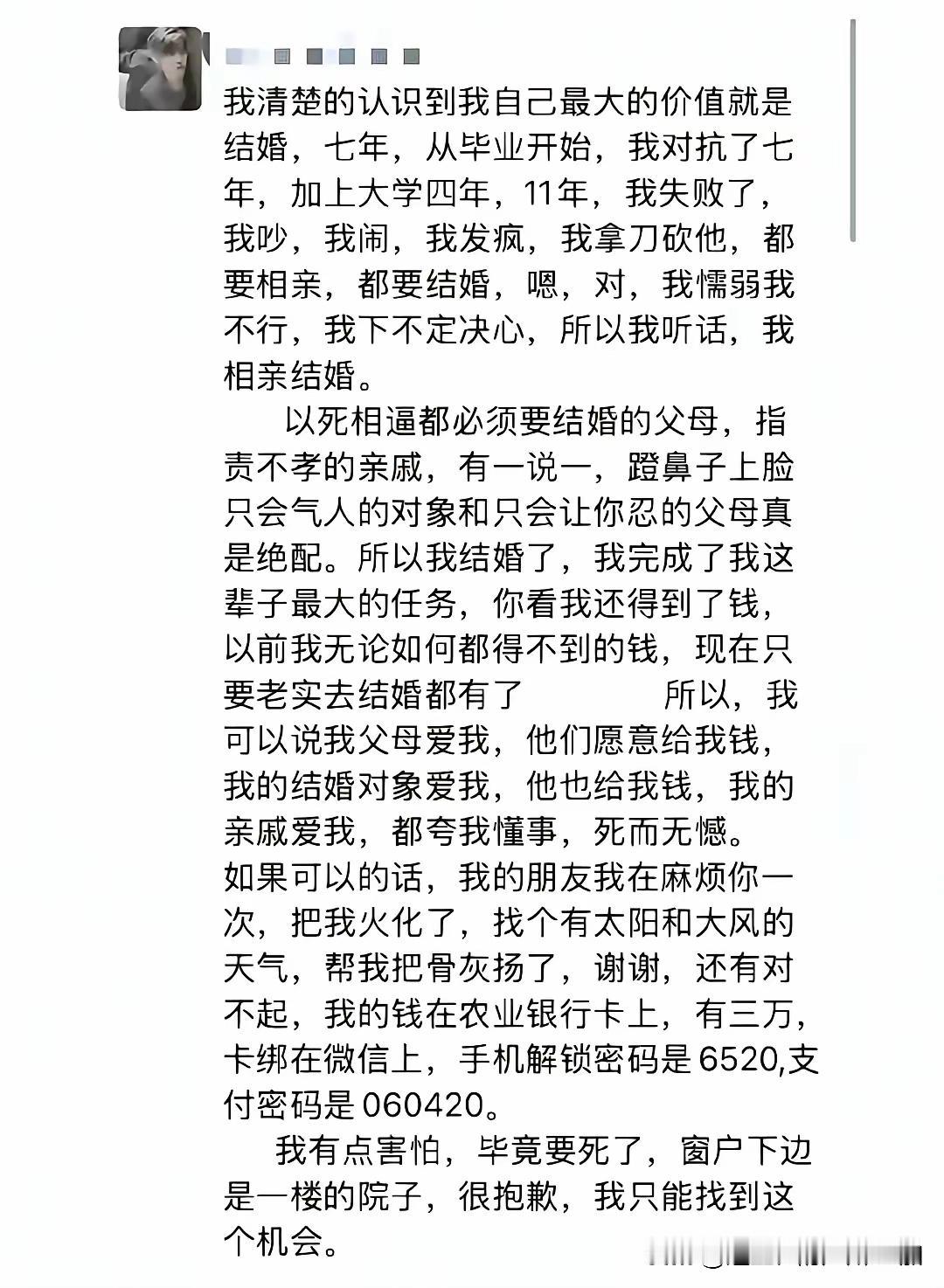 河南父女重男轻女,女的大学毕业当老师,每个月只留500,其他都上交给父母,父母说是帮攒嫁妆,其实给小儿子攒聘礼;相亲认识的上班族,她没看上对方,对方看上她了,给她父母27万彩礼,她不同意,父母说儿子买房缺首付,不同意就死给她看,她被逼无奈只能同意,最终还是没过去心里那道坎,婚前跳楼坠亡!所以总结父母要承担事件的80%,收的聘礼还不知道退了没