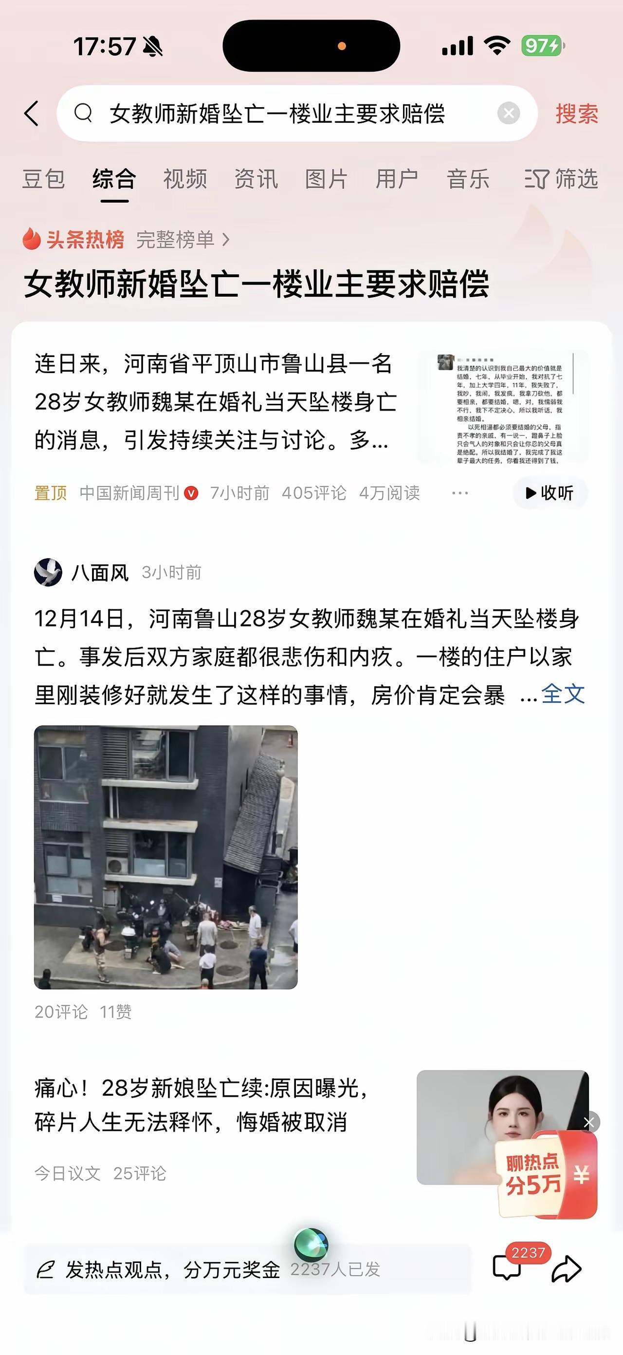 忍无可忍了,平顶山新娘跳楼后,一楼住户公平对媒体说要求赔偿。 因为这栋小区还是新开发的,一楼的住户才刚刚装修完,还没住进去这房子就变成了“凶宅”。 这一楼住户也说的对,大多数人一辈子挣的钱就只能买一幢房,还没住进去就遇到了这么不吉利的事情,谁不遭心呢! 只是这赔偿该找谁?新娘家人说女儿已经嫁出去了,新郎家人则说没有办婚礼,不算婆家人。大家说该找谁赔偿。