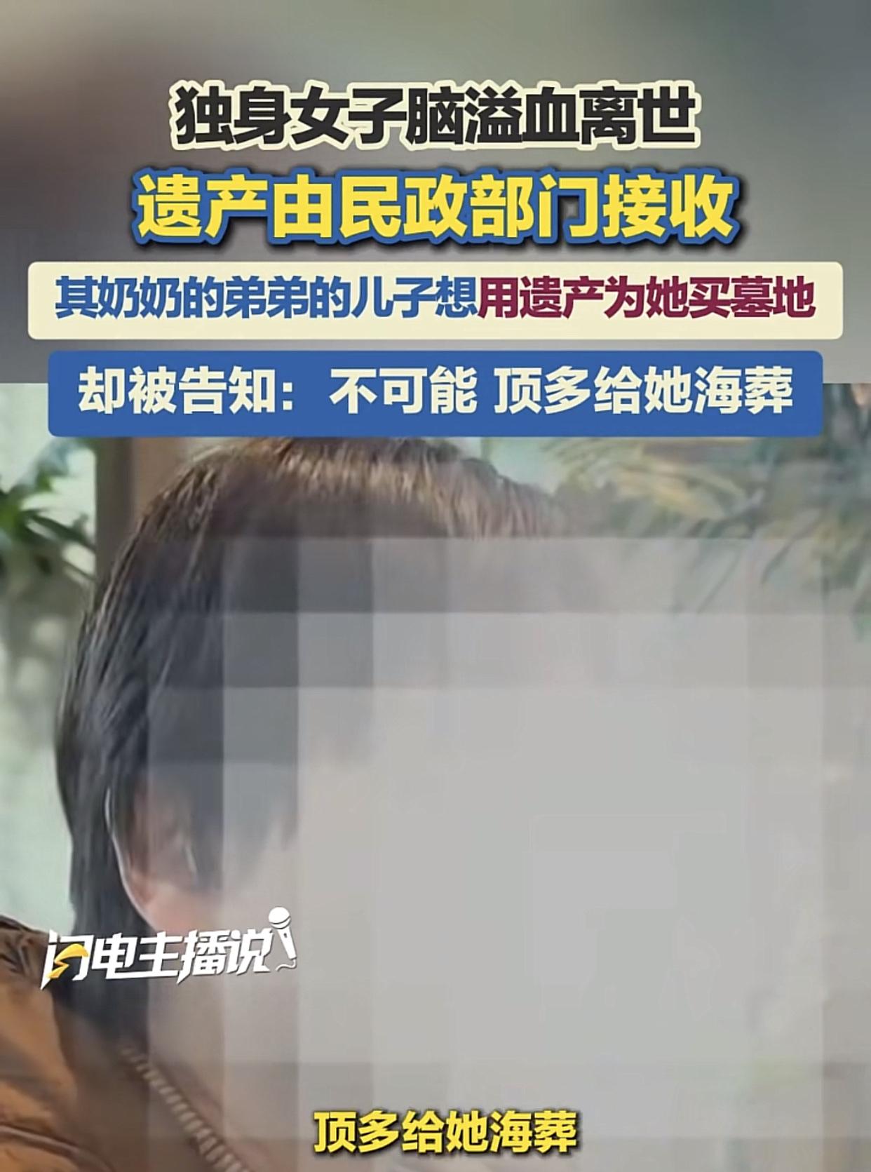 “自己的身后事,为什么不能用自己的钱?” 上海,一名46岁独身女子今年10月因发脑溢血,被公司同事送往医院救治!其间,一位远房亲戚,也就是该女子奶奶弟弟的儿子,与公司同事一起为她垫付了3万元首期的治疗费。 两个月后,该女子不幸世故 因其生前独身,在没有监护人和继承人的情况下,遗产依规依法由辖区民政局接收。事后,奶奶弟弟儿子和同事向当地民政局提出想要用女子遗留的钱来给她买块墓地,民政局表示:“不可能,只能海葬!” 后经双方协商,民政局答应了奶奶弟弟儿子的要求,买墓地可以,但要在合理范围,今后墓地所有维护费用由男子出。由此,该男子不服,双方僵持不下,未能达成一致,当地法院已介入。 (来源:闪电新闻) 有了遗产,无后人料理后事,民政局加入善后,体现责任!现在有远亲人自动料理后事,对于民政部门来说何乐不为?所以说,生前写遗嘱的重要性,尤其是这种孤寡独居的人。
