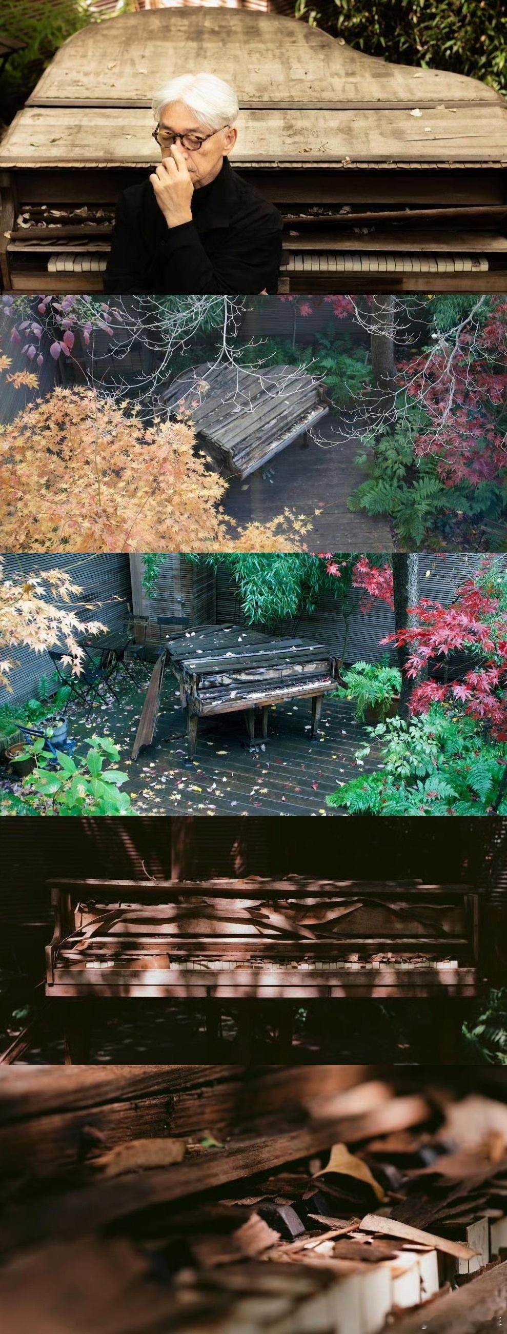 2019年春天,坂本龙一把一架破旧的钢琴放置在纽约住所的后院中,几年时间里,钢琴仿佛与季节融为一体,跟着四季更替。(图片1)2024年4月,这架钢琴回归到大自然。(图片2-3)2025年11月,周边满是秋色。(图片4-7)2025年12月,钢琴已被白雪包裹。(图片8-9)