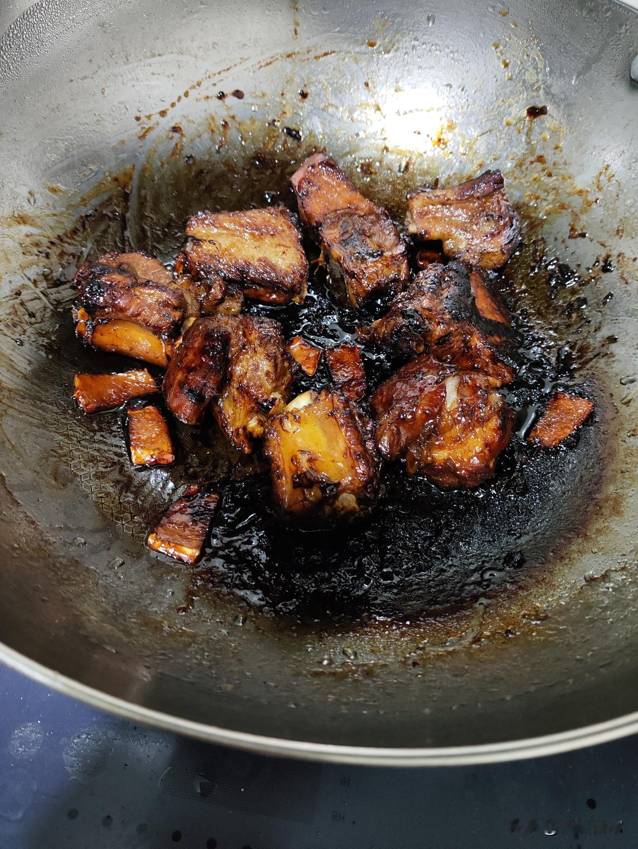 排骨煮成这样,都是手机害的。三十块钱排骨全报废了。 很长时间没有吃红烧排骨。今天买了三十块钱排骨回来,做红烧排骨,排骨放入锅里之后,就顾着去看手机,忘记了去看火。等想起的时候,打开锅盖一看,排骨已经煮成了黑炭,三十块钱的排骨,就这样报废了。