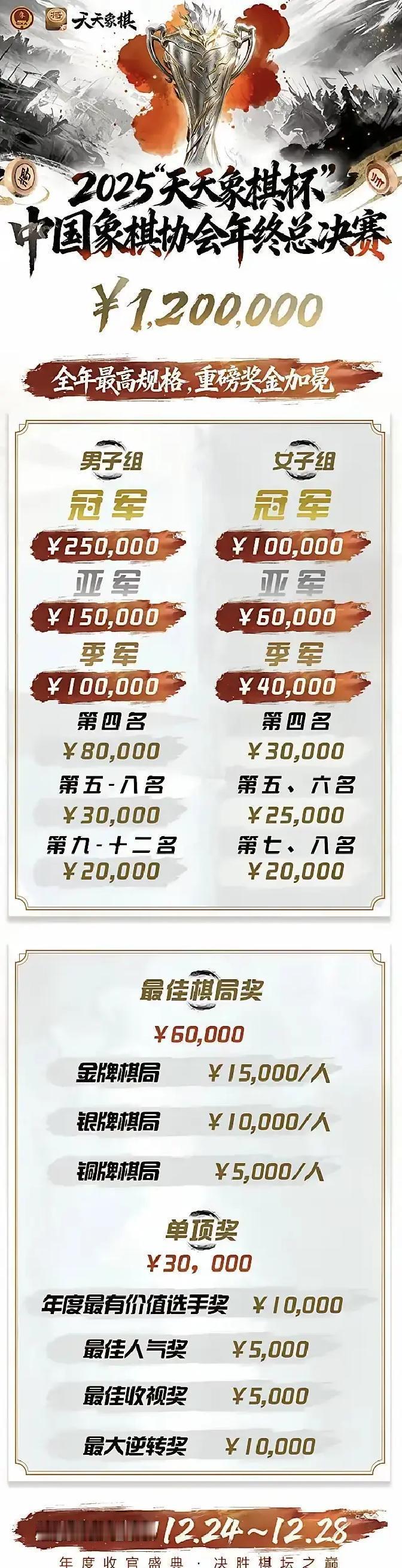 下象棋也能挣百万?今年的冠军直接海口买房首付。 别以为楚河汉界只是公园消遣。曹岩磊刚在联赛砍翻一众特级大师,00后的王禹博、孟繁睿已经横扫亚洲——棋桌前坐着的,是货真价实的国家斗士。他们走一步棋的思考量,比你一天做的决定都多。 这场决赛不一样。唐丹刚生完孩子,回来就拿下快棋冠军。她坐在棋盘前,左手是母亲的角色,右手是棋后的锋芒。你看的不是棋,是一个女人如何在两个世界同时称王。 赛场搬到了海南澄迈。你闻见咖啡香,抬头就能看见柳大华闭着眼睛,同时应对二十个挑战者。转头打开抖音VR直播,镜头能贴到棋手皱眉的汗珠上。象棋不再只是沉默的厮杀,它成了你能浸泡其中的文化节日。 他们争夺的早就不止是奖杯。新增的“最佳对局奖”,由你我的投票决定。每一票,都在重新定义什么叫“好看”。 12月,当北国飘雪,这群最聪明的大脑在椰风海韵中运筹帷幄。他们证明了一件事:真正的智力从不褪色,它只会在新时代换一种更锋利的活法。 这不是游戏,是人生棋局最极致的隐喻:你永远不知道,下一步会遇见多强大的自己。