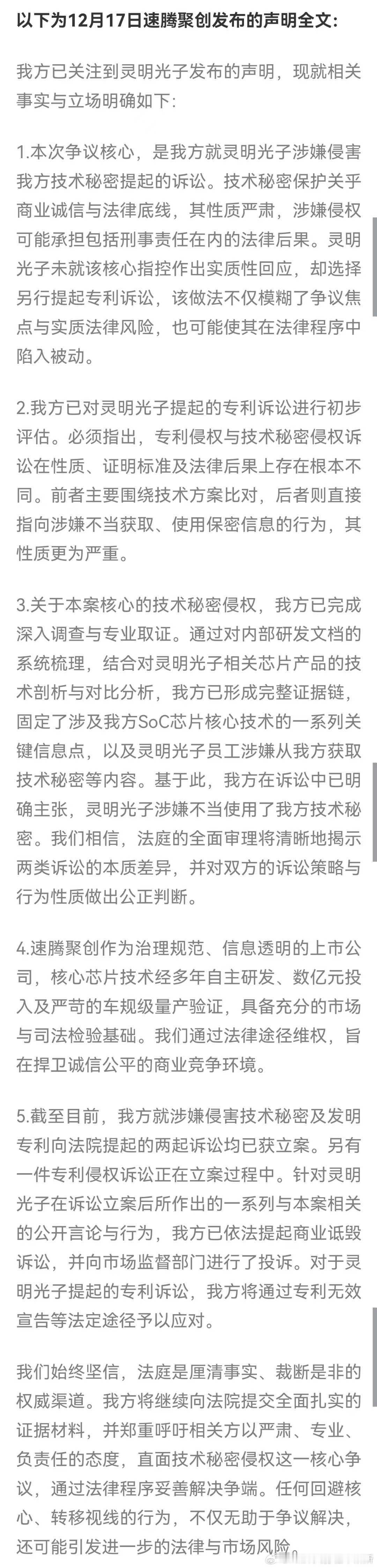 速腾聚创诉灵明光子的知识产权案,速腾做了进一步的回应。纠纷的焦点是这代激光雷达核心的SPAD SoC的知识产权。此前,速腾就「涉嫌侵害技术秘密」及「发明专利」,向法院对灵明光子提出两起诉讼;灵明光子也反向提起了专利诉讼。速腾的声明指出:侵害技术秘密的诉讼跟专利诉讼是两码事,灵明光子的操作属于模糊焦点,并且两者的性质严重性根本不是一码事。图2是速腾的回应全文。$速腾聚创 hk02498$ 新能源汽车