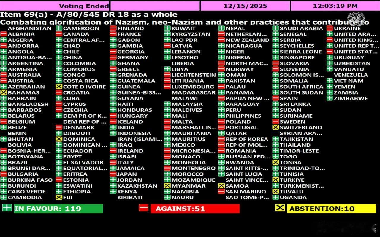联合国大会通过了关于打击美化纳粹主义的决议,投反对票的少数国家包括:乌克兰、德国、日本、意大利、美国、英国、法国、捷克、奥地利、比利时、保加利亚、罗马尼亚、波兰、爱沙尼亚、拉脱维亚、立陶宛、挪威、丹麦、芬兰、西班牙、加拿大、澳大利亚、新西兰、韩国等。来源:Операция Z: Военкоры Русской Весны俄乌局势新进展乌克兰已放弃加入北约 俄乌战争真的要剧终了吗
