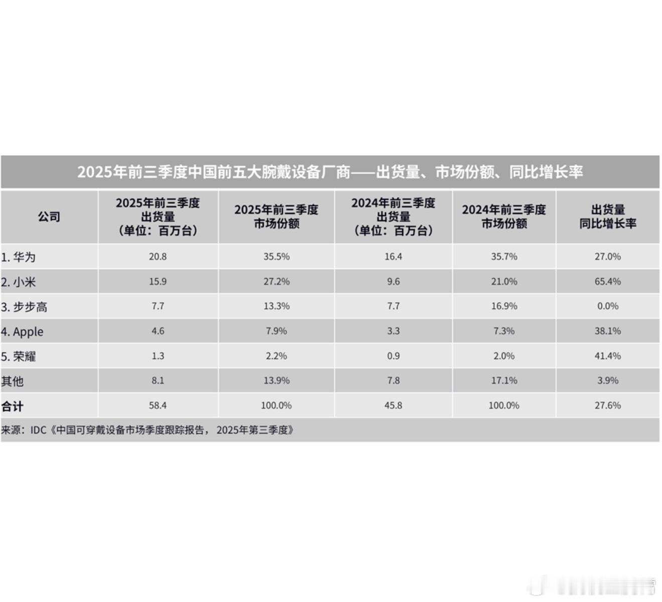 我寻思华子产品在各个领域真就全面开花啊,IDC公布的最新数据来看又赢麻了。2025年前三季度全球腕戴设备市场出货量排名,华子拿下第一,出货量达2860万台,全球市场份额18.6%,而中国市场同样也是第一,出货量2080万台,拿下35.5%市场份额,你们应该没想到华为智能穿戴产品卖那么好吧