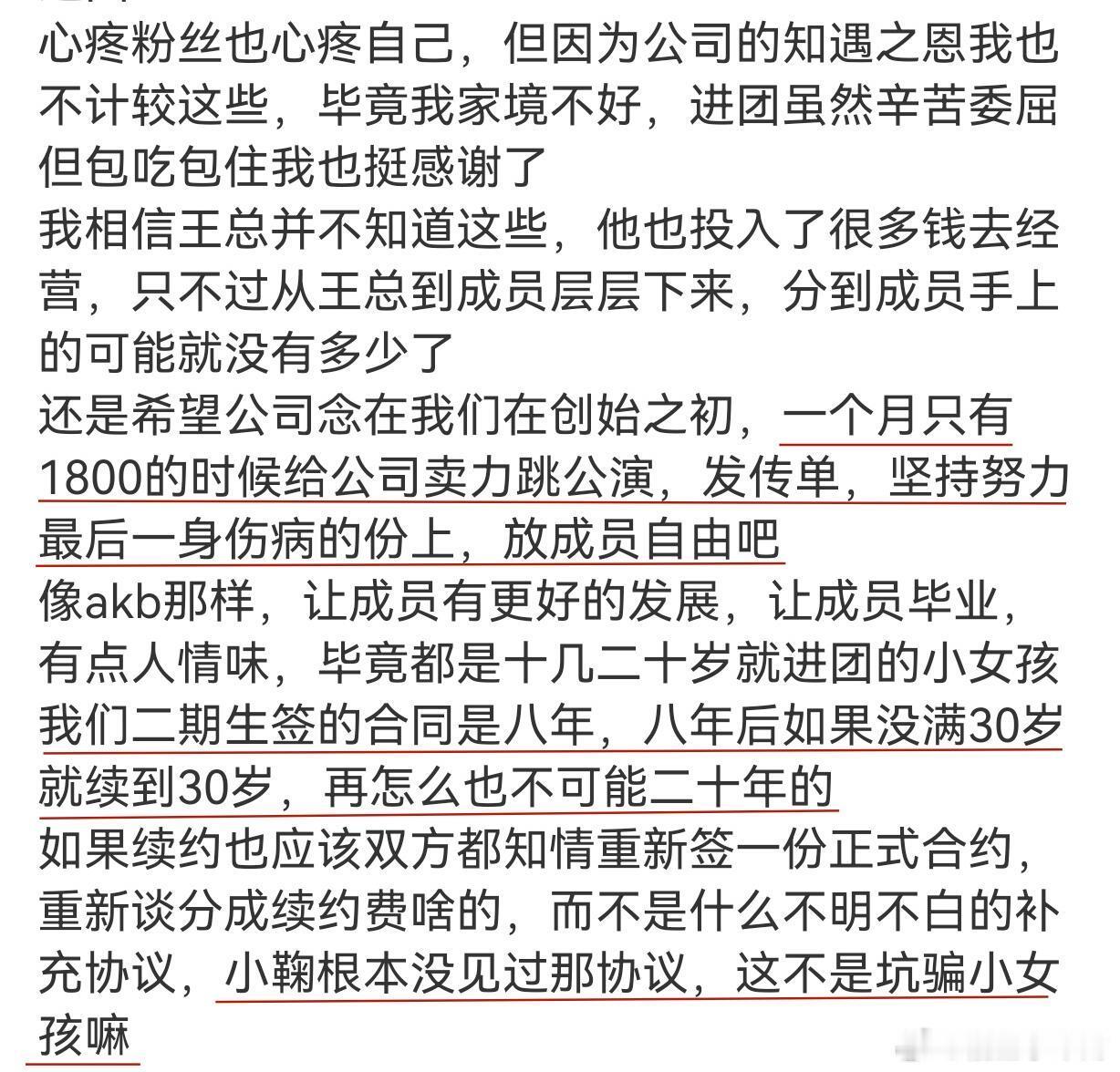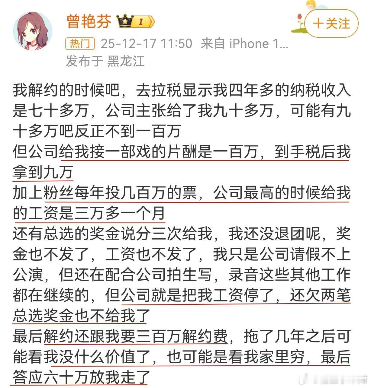 曾艳芬说丝芭坑骗鞠婧祎17日,SNH48前成员曾艳芬发文回顾自己在丝芭时的待遇收入,称公司给她接一部戏的片酬是一百万,但到手税后她拿到九万,粉丝每年投几百万的票,而丝芭最高的时候给她工资是三万多一个月。解约的时候还想跟她要三百万的解约费,“拖了几年之后可能看我没什么价值了,也可能是看我家里穷,最后答应六十万放我走了。”曾艳芬与鞠婧祎同为SNH48二期生,她称“如果续约也应该双方都知情重新签一份正式合约,重新谈分成续约费啥的,而不是什么不明不白的补充协议,小鞠根本没见过那协议,这不是坑骗小女孩嘛。”她还透露公司曾安排挑选一些成员去陪老板喝酒,“我相信王总是会保护成员的,不会让成员去做什么很过分的事,只是一个应酬估计陪陪喝酒吃饭啥的。”