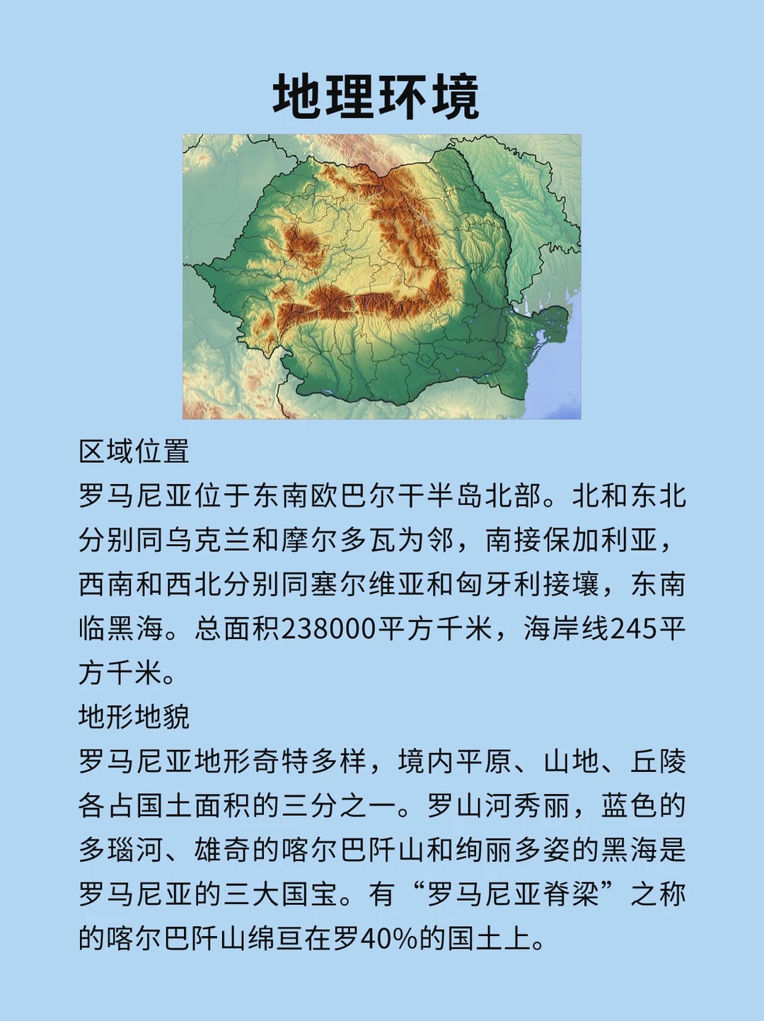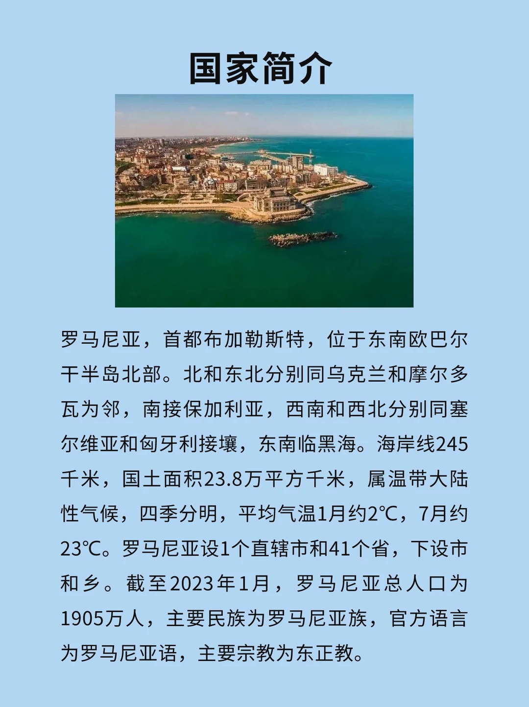 [打卡R]罗马尼亚,首都布加勒斯特,位于东南欧巴尔干半岛北部。北和东北分别同乌克兰和摩尔多瓦为邻,南接保加利亚,西南和西北分别同塞尔维亚和匈牙利接壤,东南临黑海。 [种草R]海岸线245千米,国土面积23.8万平方千米,属温带大陆性气候,四季分明,平均气温1月约2℃,7月约23℃。罗马尼亚设1个直辖市和41个省,下设市和乡。 [彩虹R]截至2023年1月,罗马尼亚总人口为1905万人,主要民族为罗马尼亚族,官方语言为罗马尼亚语,主要宗教为东正教。