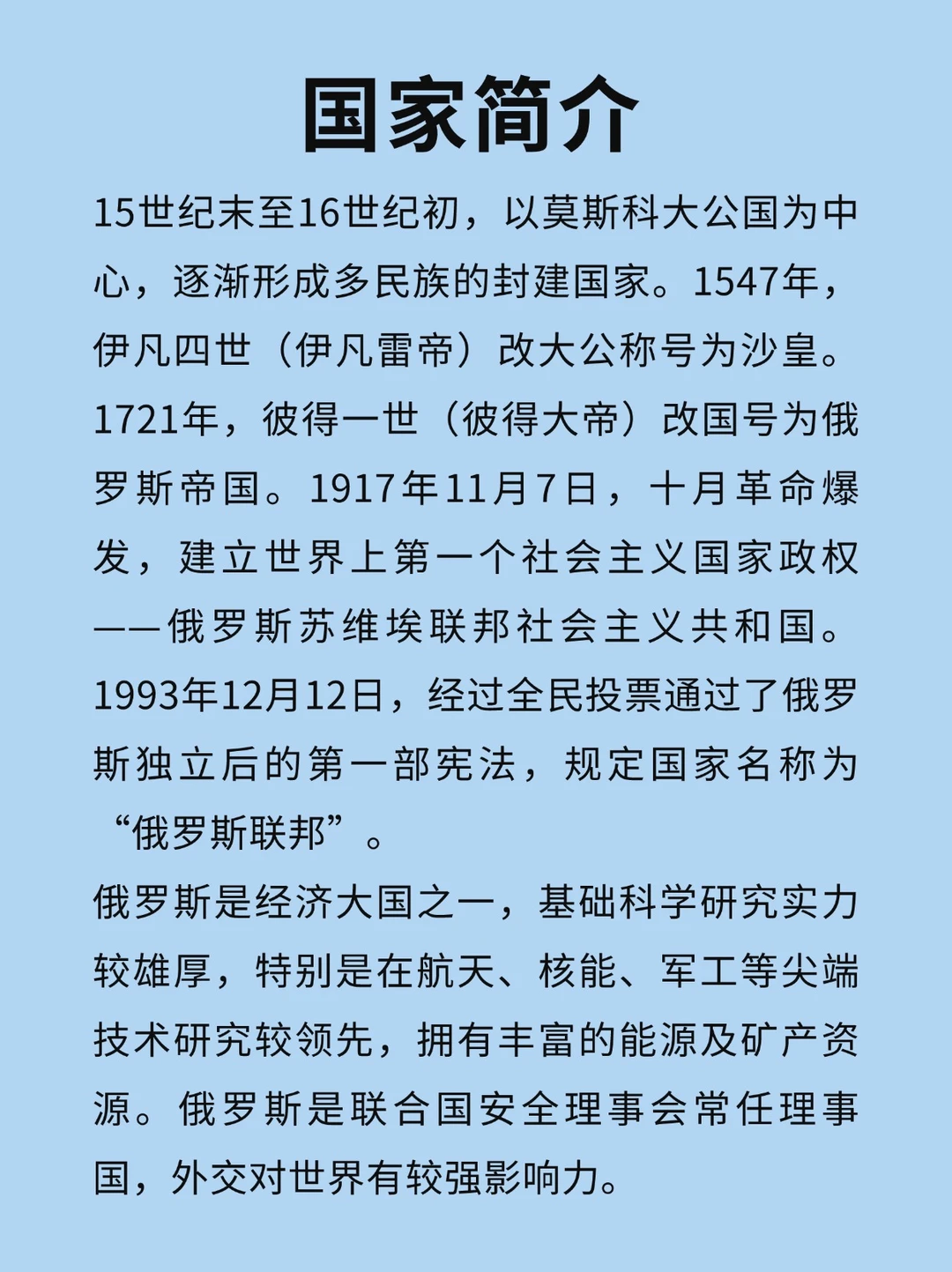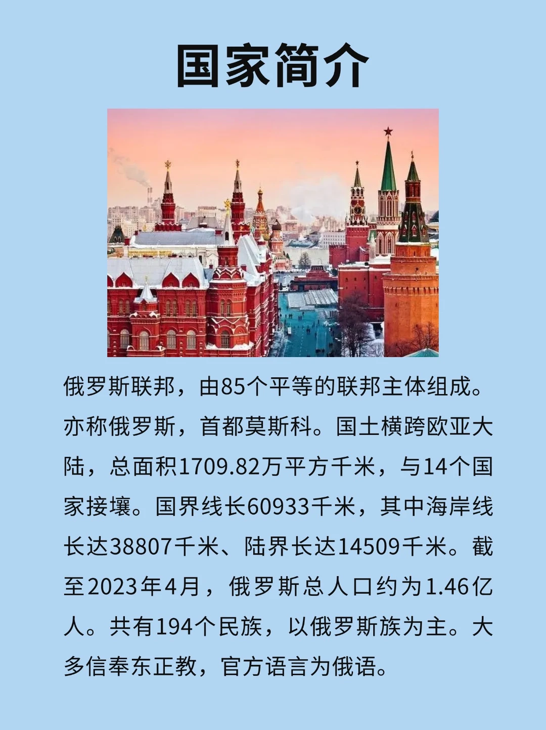 [种草R]截至2023年4月,俄罗斯总人口约为1.46亿人。共有194个民族,以俄罗斯族为主。大多信奉东正教,官方语言为俄语。俄罗斯是经济大国之一,基础科学研究实力较雄厚,特别是在航天、核能、军工等尖端技术研究较领先,拥有丰富的能源及矿产资源。