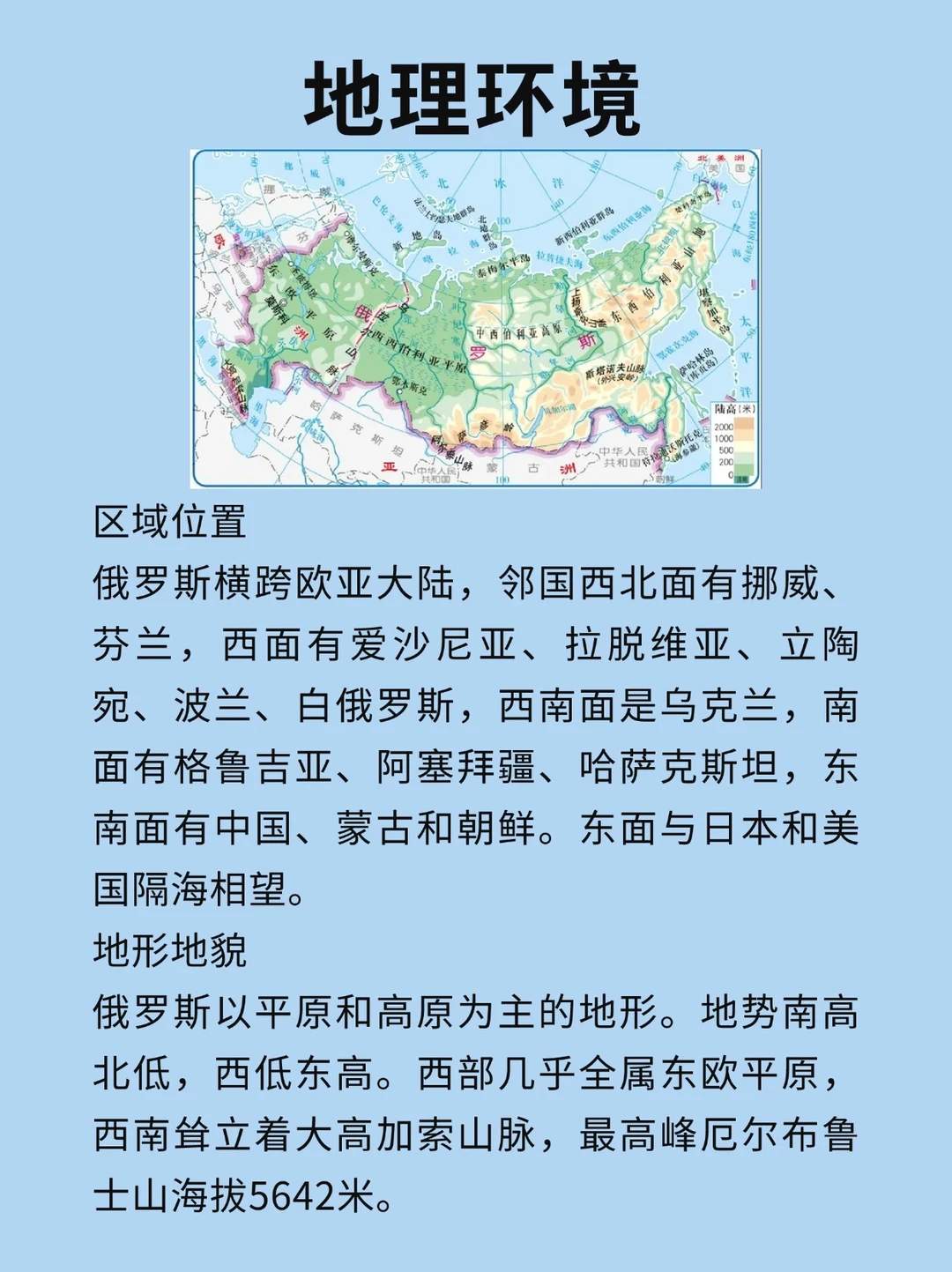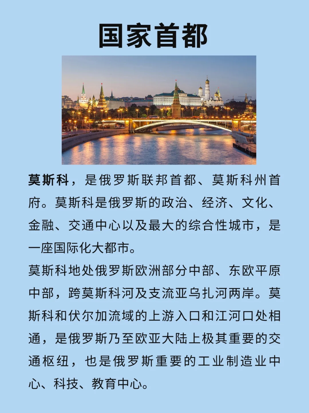 [彩虹R]俄罗斯联邦,由85个平等的联邦主体组成。亦称俄罗斯,首都莫斯科。国土横跨欧亚大陆,总面积1709.82万平方千米,与14个国家接壤。国界线长60933千米,其中海岸线长达38807千米、陆界长达14509千米。
