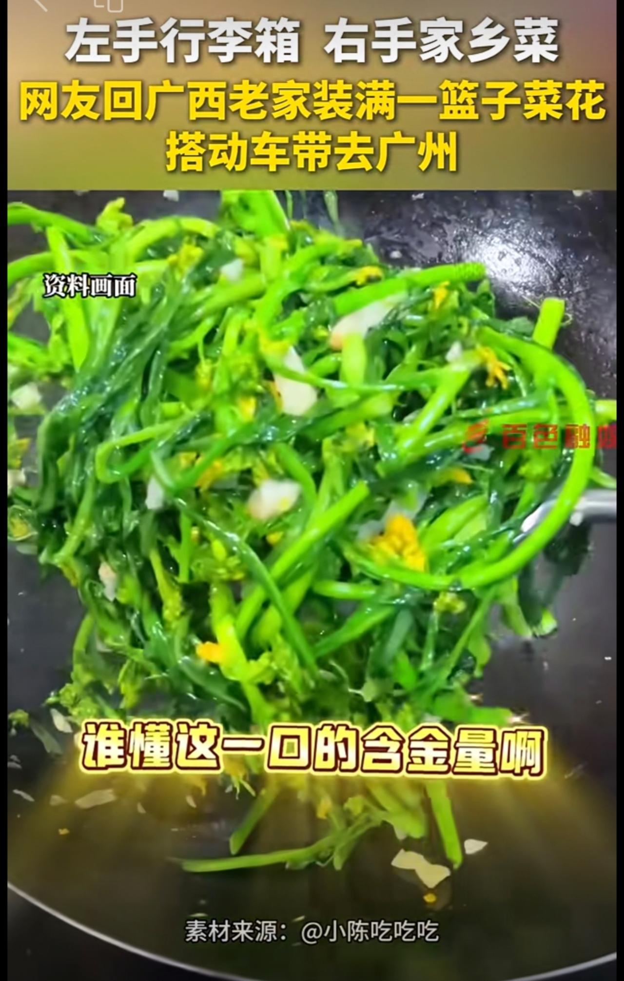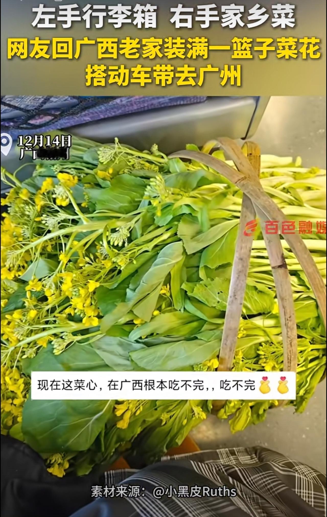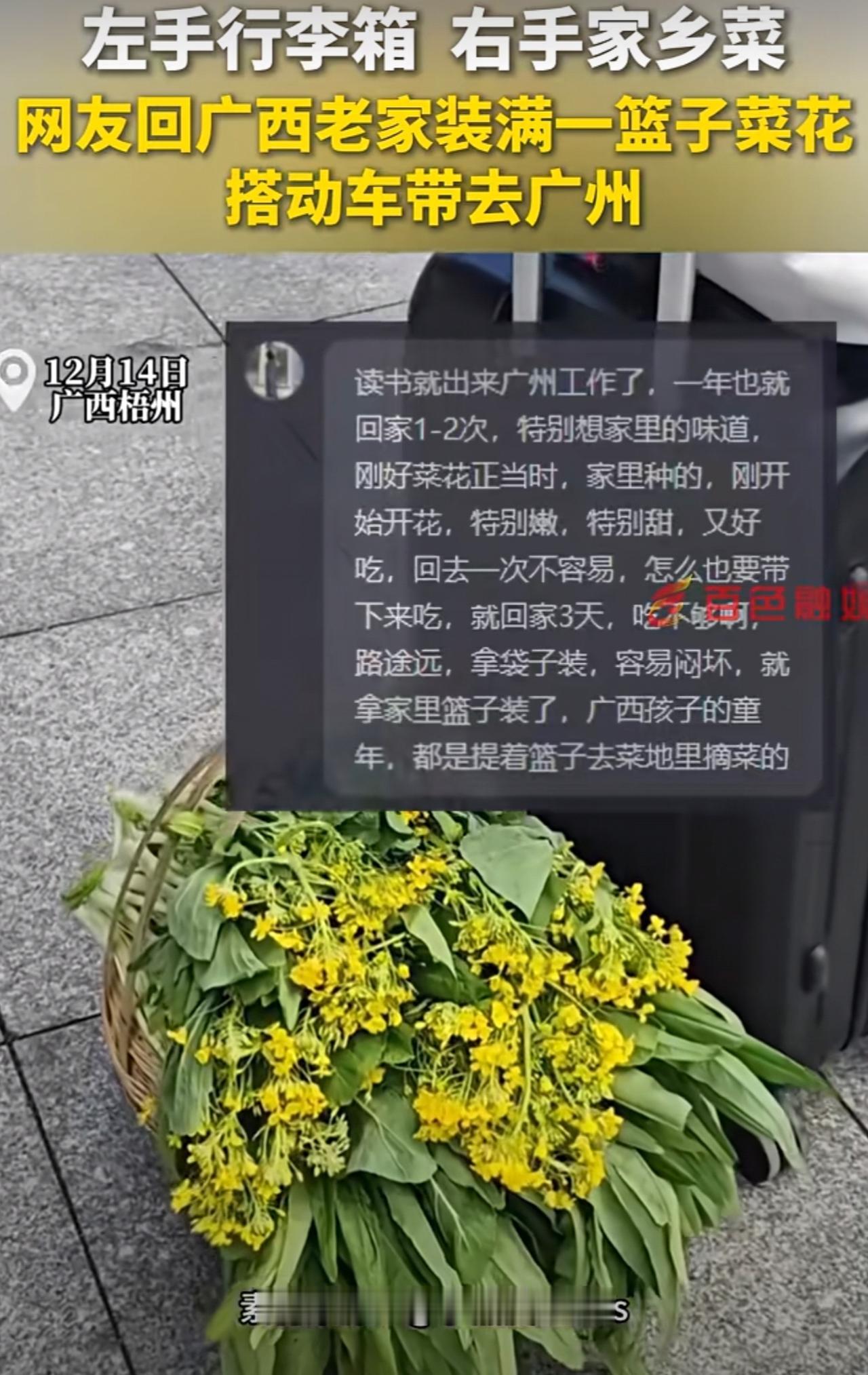 网友回广西老家装满一篮子菜花,搭动车带去广州。(来源:贺州市广播电视台)