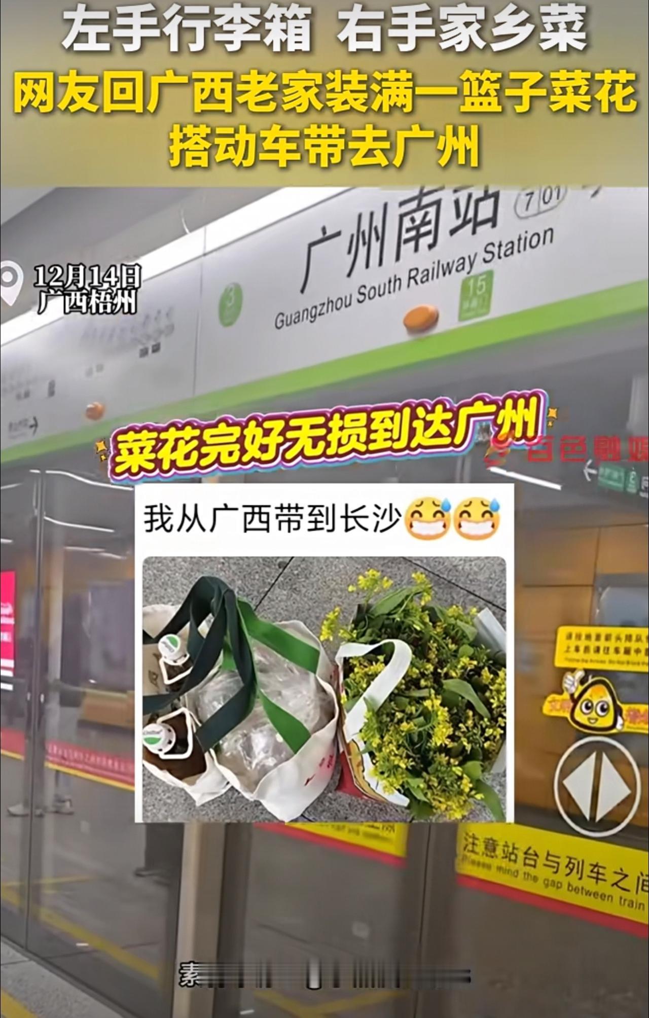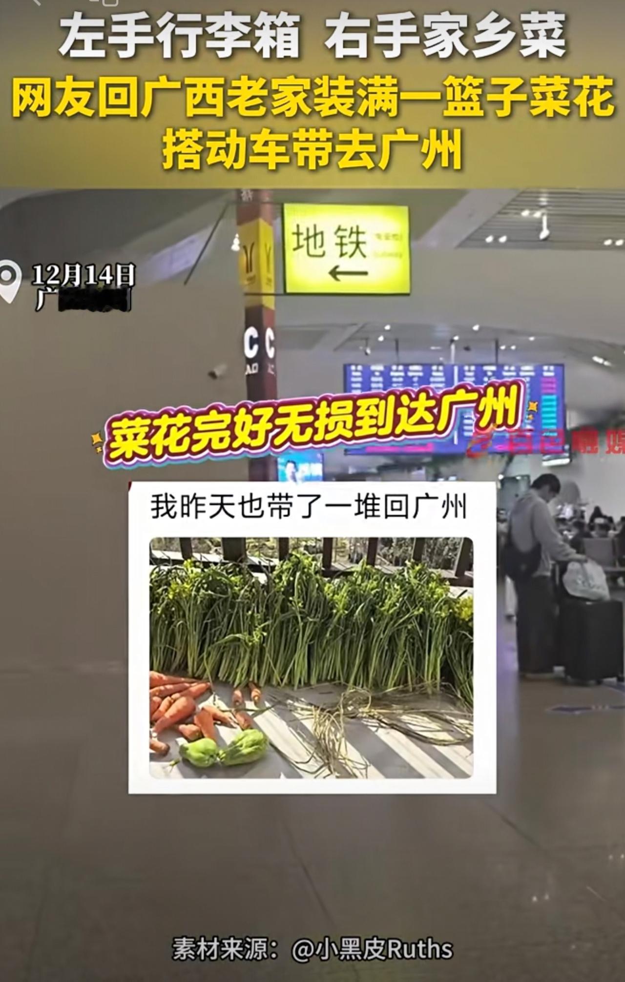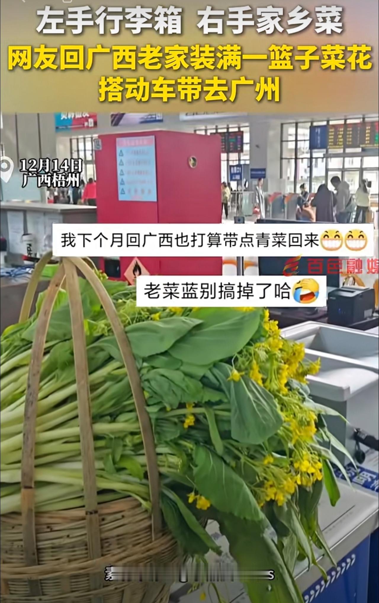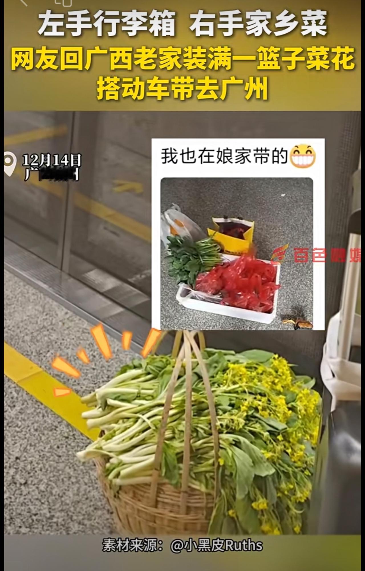 网友回广西老家装满一篮子菜花,搭动车带去广州。(来源:贺州市广播电视台)