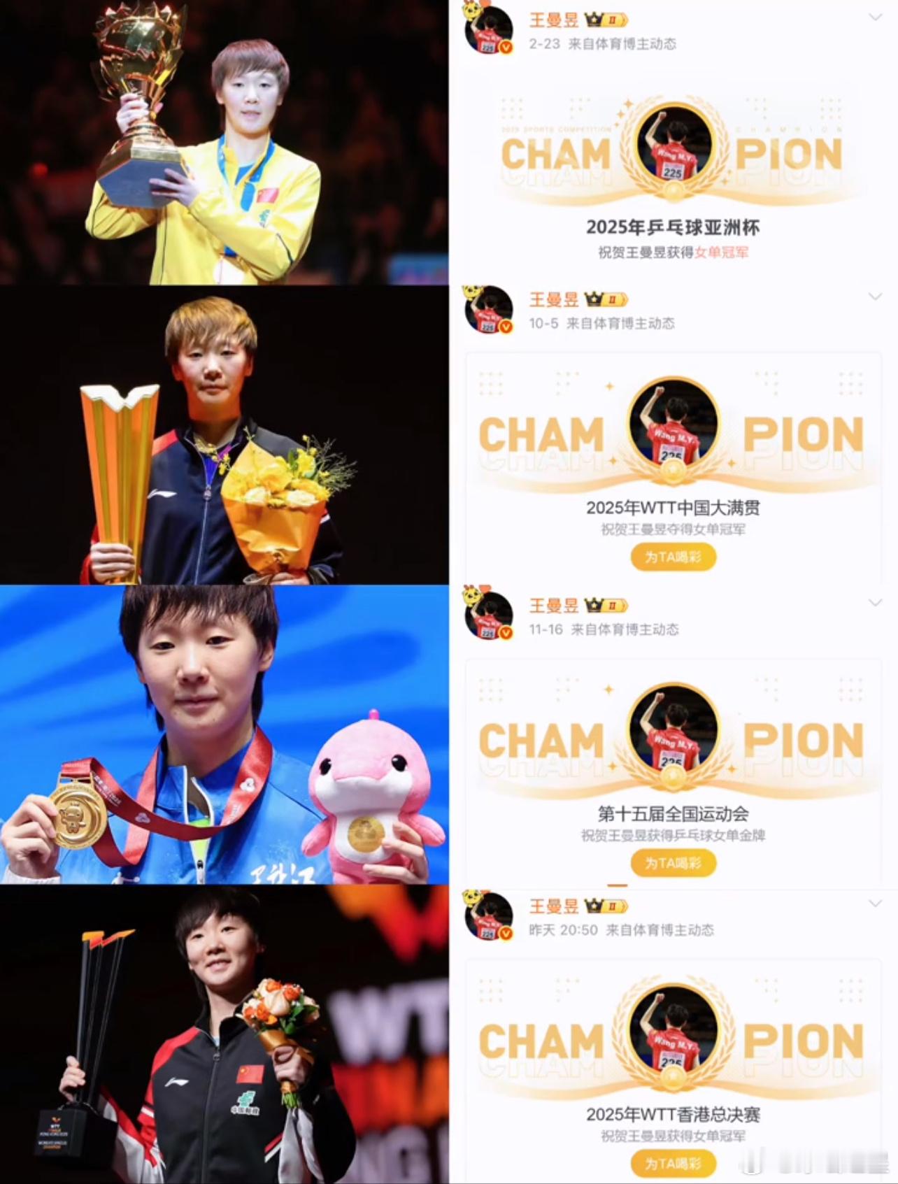 有些记录不用多说,摆在那里就是一种震慑。从休斯敦的巅峰对决,到全运会的炼狱突围,再到杭州亚运的捍卫荣耀。王曼昱在这些重磅赛事中的单打统治力,是经得起时间考验的。每一块金牌背后都是顶级的高手过招,鳗鱼这收割大赛冠军的能力,真的太硬核了。超级全满贯的拼图,正在一块块拼凑完整。