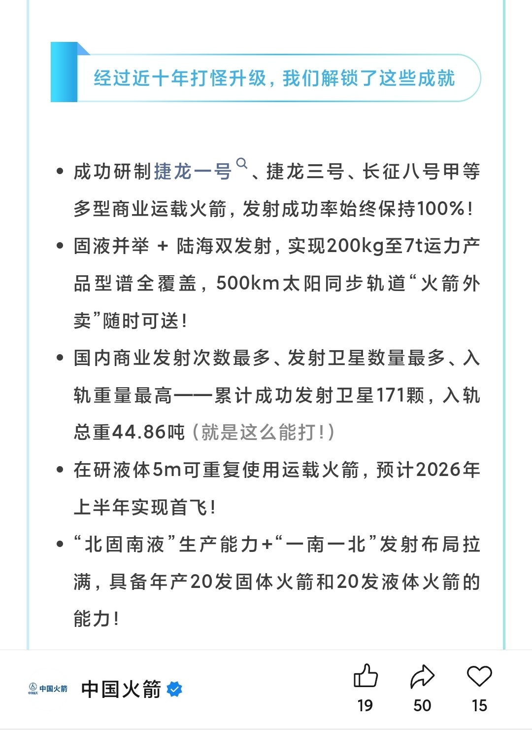 在研液体5m可重复使用运载火箭长征十号乙,预计2026年上半年实现首飞。2025年7月3日,5m可重复商用运载火箭“长征十号乙”研制完成立项,该火箭充分借鉴并升级捷龙三号、长征八号改市场化研制模式,具有“大运力、高效率、低成本”的特点:一子级回收状态下近地轨道(200km LEO)运载能力不小于16t,900km 50°轨道倾角运载能力不小于11t,不仅能够满足国家大规模空间站建设、月球基地建设、火星采样返回等深空探测任务的运力需求,也可满足卫星互联网、太空旅游、空间资源开发等新兴领域对低成本、可靠航天运输系统的需求,未来将成为极具市场竞争力的商业航天主流产品。
