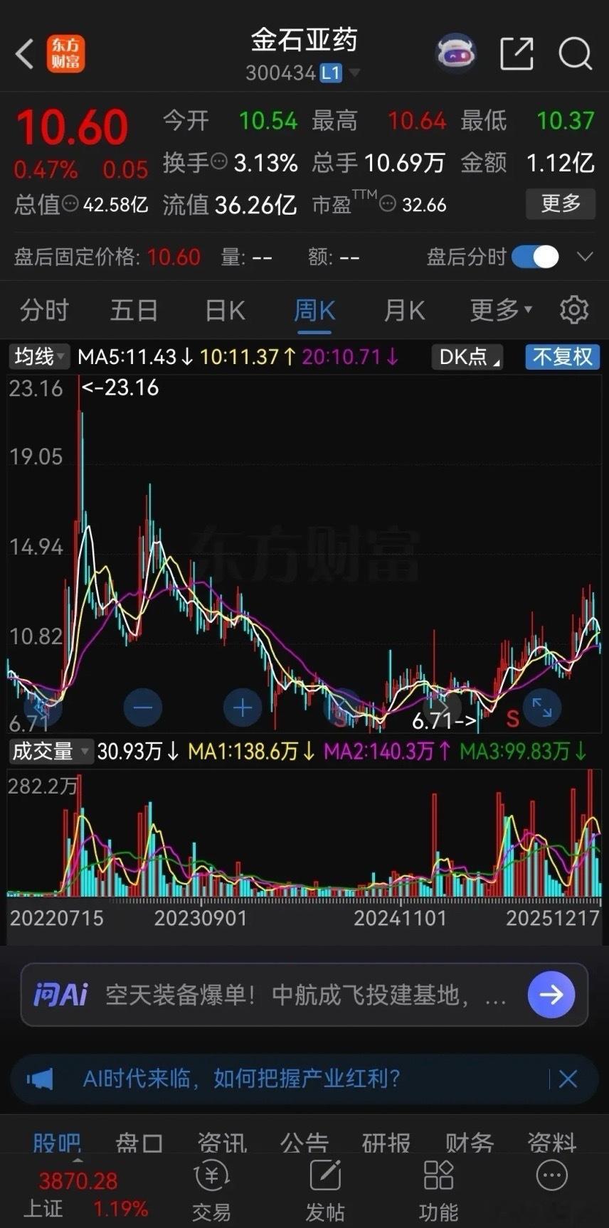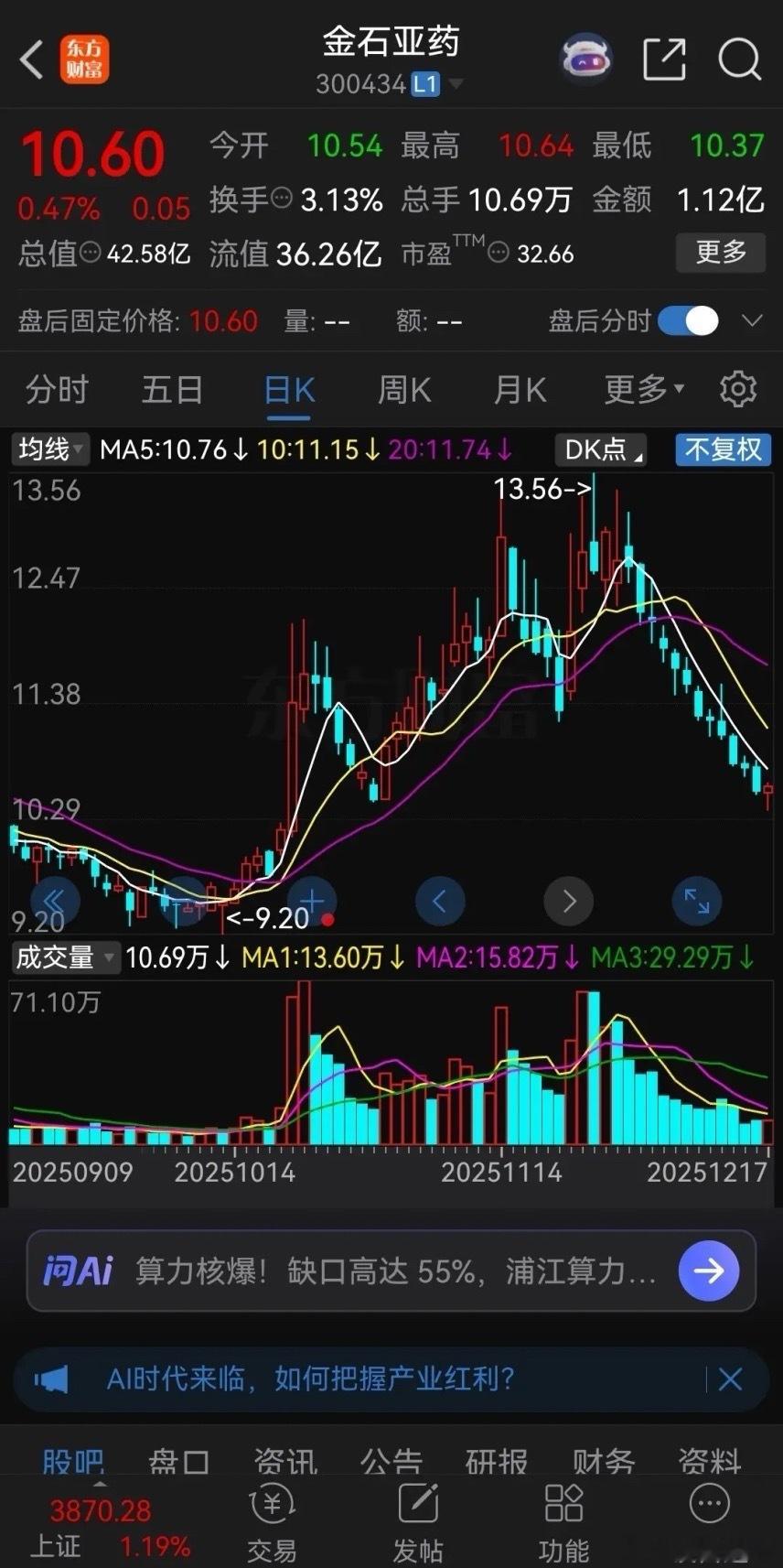 这走势,股民们都要吐了!金石亚药连续收出12根阴线,昨天勉强收出一根小阳线,公司股价今年本来就没咋涨,10月份刚走出上升趋势,不少股民纷纷跑步进场,还以为捡到了宝。结果最近却连续崩盘式下跌,这一跌把近两个月进场的股民基本都套住了。有些股票,你看着很便宜,性价比很高,其实它是等待你入坑呢!