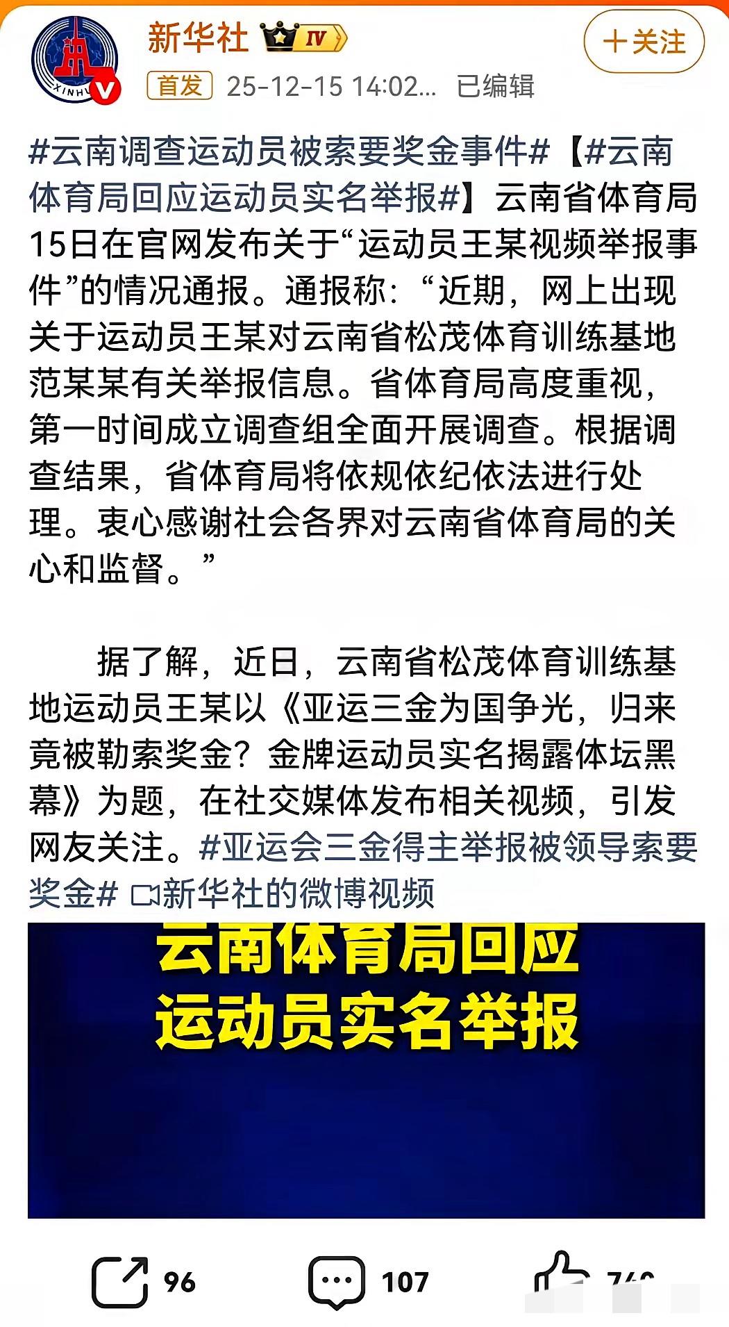范继文傻眼了,云南体育局也懵了,没想到范继文向亚运会三金运动员王莉索要15万奖金的事,连新华社也关注了! 要知道王莉可是云南首个亚运三金运动员,手掌磨满老茧、冬天训练手指冻到要别人掰开,减重7公斤才换来的荣誉和奖金,凭啥要被训练基地负责人变相索要?更离谱的是,没拿到钱就搞打压,说“饭碗是我给的”,还擅自上报退役材料、谎称她有伤病断了她的参赛路。 这哪儿是培养运动员,分明是借着职权欺负人!体育圈的干净,从来都该靠公平和尊重撑着,不是让少数人把运动员的血汗当“摇钱树”。运动员拼尽全力为国争光,背后该是坚实的支撑,而不是这样的糟心事。 现在调查组已经行动,但大家更关心的是,这样的情况是不是个例?该怎么守住运动员的合法权益,不让他们流血又流泪?你觉得该如何避免类似的事情发生?