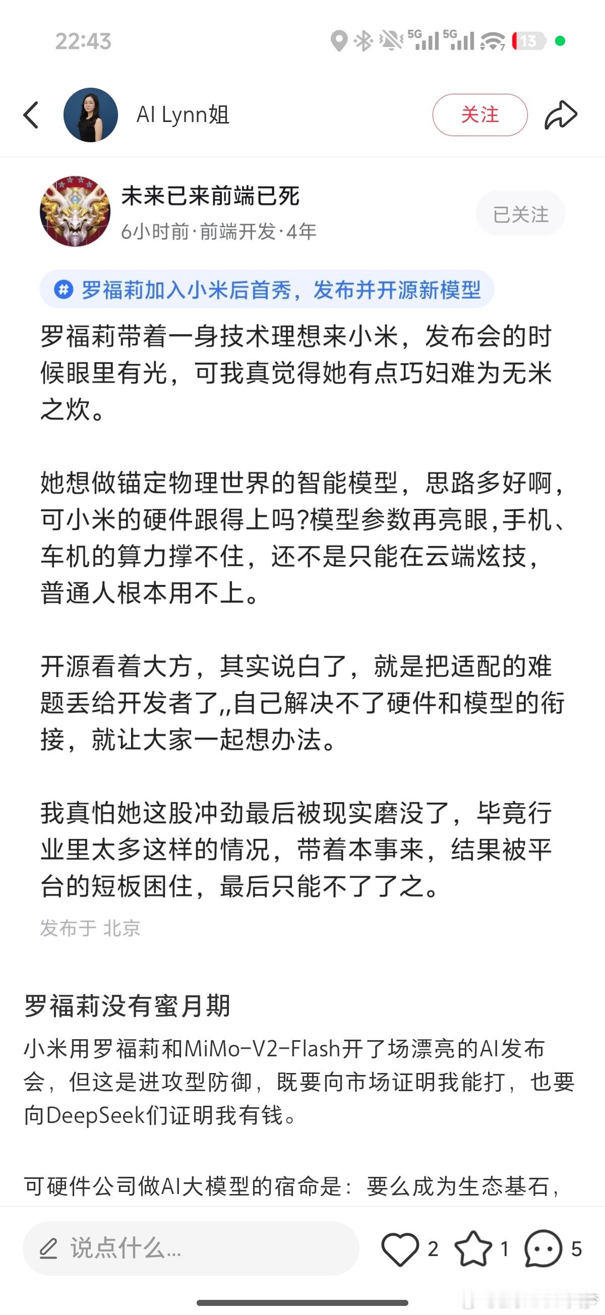 从铎神的朋友圈你就能感受到很多东西,尤其是小米 公司的氛围和文化,也就能理解为什么罗福莉会选择去小米,我觉得几乎是一个必然的选择。看了罗福莉演讲的朋友应该都能知道,很年轻很有才华的一个妹子,冲劲也很强,被叫做天才少女其实一点也不过分,这样的年轻人一般不太喜欢过于复杂的职场关系,所以评论区有人在说她应该去 XX 才能发挥真正的实力,就纯属抽象了。然后你从铎神的朋友圈里可以看到,小米 Ai 团队也几乎算是从零开始起步,但一步一个脚印取得的成果,对于团队内部所有人的正反馈都是无比巨大的,这就是成就感。是的没错,我觉得很像 SU7 Ultra 的产品团队,就像他们把 SU7 Ultra 开发定义出来那样,小米 MiMo 也给到了大家同样的感觉。我在想,这可能就是企业文化吧,也算是小米最难能贵的一部分了,即便是成为了大公司、世界 500 强,在尝试新业务还能有像创业公司的脚踏实地,以及这么一帮优秀人才在。这个问题以前也跟一些朋友讨论过,他说小米既有大公司病又有一些创业团队的问题,我觉得说的也对,但你换个角度,小米就是既有大公司的规模优势,又有创业公司的草莽不服输的精神,所以我们才能看到 小米汽车、玄戒、MiMo 的出现。看待小米还是应该时间拉的更长一些,进入到 Ai 时代以来科技行业发展巨快,几乎每一个品类都可以再用 Ai 重做一遍,而小米已经在各个领域都已经初具规模,再加上 MiMo 的发布,我始终相信像小米这样脚踏实地搞研发的企业,一定会成为中国科技企业的代表,走出国门、赢得尊重与认可。