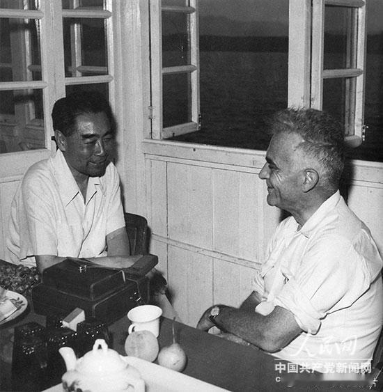 1960年8月30日,周恩来在密云水库的游艇上和美国记者埃德加·斯诺交谈。