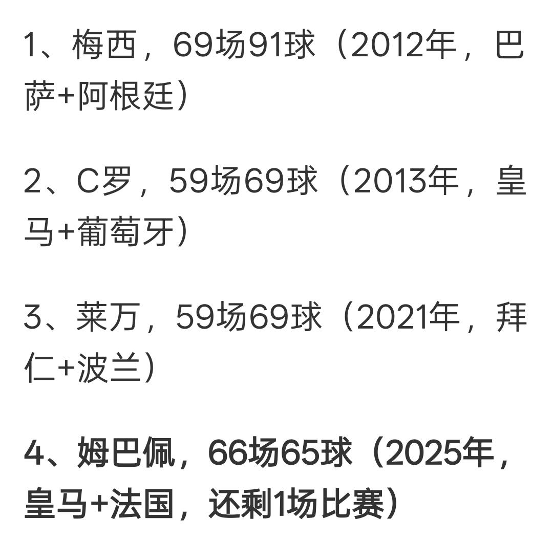 强中自有强中手,一山还有一山高,现在姆巴佩应该深深理解这句话的含义了! 对阵塔拉维亚梅开二度之后,姆巴佩2025年66场俱乐部和国家队比赛打进65球,距离身前的莱万和C罗只有4球之差。 但是当姆巴佩再仰头看时,却看到了那个神一般高高在上的存在:球王梅西! 2012年69场各项赛事打进91球,场均打进1.31球。 要想追上梅西的这一纪录,意味着姆巴佩还需要打进26球。 26球是什么概念呢? 去年的西甲联赛最佳射手姆巴佩是31球,英超联赛最佳射手萨拉赫是29球,意甲联赛最佳射手雷特吉是25球,法甲联赛最佳射手登贝莱是21球。 想到这里,姆巴佩不能不感叹:梅西真的是神一般的存在!