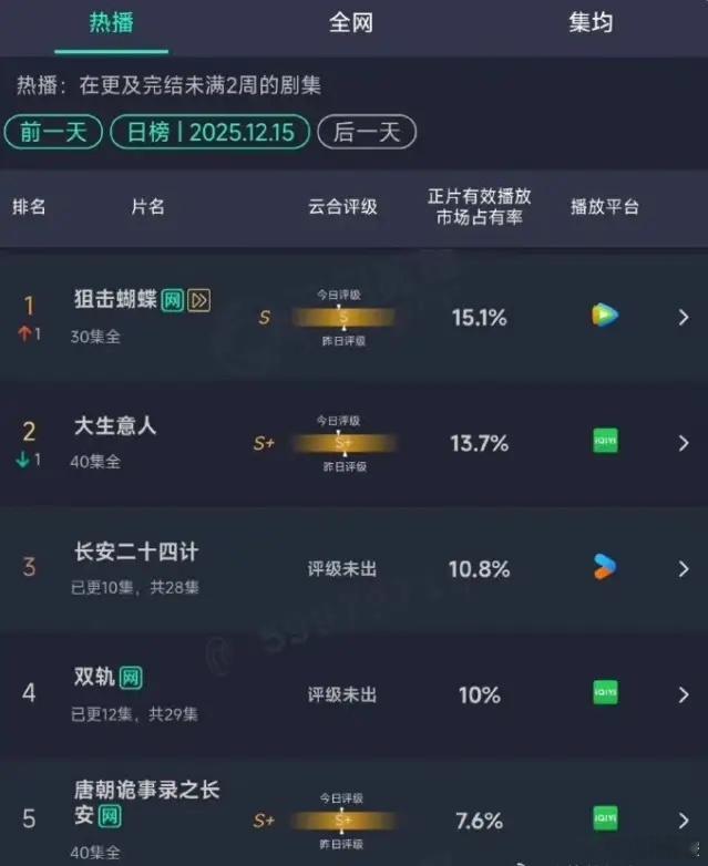 《狙击蝴蝶》赶在超点日云合登顶!好歹是赶在大结局前云合登顶,压了陈晓的《大生意人》一次,同时《双轨》云合占比被《长安二十四计》反超,下一步看《双轨》和《长安二十四计》谁能登顶了,如果不赶紧点,《唐诡奇谭》马上就要来了,不过这次《唐诡奇谭》播前宣传动静不大。