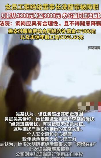 “色欲熏心?”湖北大冶,女子本是办公室副主任,董事长指定让她“清洗办公室窗帘”,女子果断拒绝,却被降职到打字员,4300元月薪也降到3000元,还招新人替代女子工作,甚至换了女子办公室的门锁,女子这个憋屈,因为董事长经常给她发骚 扰信息,她多次明确拒绝,却遭董事长调岗降薪报复,女子一气之下告上法院,法院作出公正判决。 “色欲熏心?” 这四个字,成了湖北大冶某公司办公室副主任吴女士2023年最扎心的标签。 当董事长以“清洗办公室窗帘”为名暗示特殊服务时,她果断拒绝,却换来一连串报复。 那么,在这场职场闹剧背后,藏着多少女性不敢言说的隐痛? 2023年2月的某个下午,吴女士正埋头整理文件,手机突然震动。 董事长李某发来消息:“小吴啊,今天下班前把办公室窗帘拆下来洗干净,明天我检查。” 吴女士盯着屏幕愣了几秒。 作为办公室副主任,她的职责清单里从未有过“洗窗帘”这一项。 更让她警觉的是,董事长特意强调“亲自检查”。 这哪是打扫卫生?分明是变着法儿试探底线! “李董,我这会儿手头还有急活,要不让保洁阿姨来弄?”她试着委婉推脱。 不料对方回了句:“你是副主任,这点小事都搞不定?” 吴女士看着这话,攥紧了手机。 她早察觉不对劲,李某总爱发暧昧表情包,开会时借机搭肩,甚至深夜发语音说“你比我家那位懂事多了”。 每次她明确拒绝,对方就冷笑:“装什么清高?职场不就这样?” 那天晚上,她翻出手机里的聊天记录,上百条露骨消息。 从“今晚加班陪我吃个饭”到“你穿白裙子真好看”,每一条都标着红点。 她咬着牙把截图备份到云端:“这次绝不忍了!” 第二天一早,人事部通知吴女士:“经研究决定,免去你办公室副主任职务,调至打字员岗位,月薪调整为3000元。” 她冲进董事长办公室质问:“凭什么降我职?” 李某翘着二郎腿喝茶:“你连洗窗帘都不肯,说明不适合管理岗。公司给你机会,别不识抬举。” 更绝的是,当天中午她回到工位,发现抽屉被清空,电脑账号被注销,连办公室钥匙都打不开了。 隔壁同事偷偷告诉她:“HR正在招新人呢,说是要‘优化团队’。” 吴女士气得浑身发抖。 她想起去年冬天,李某曾借口“送温暖”摸她手背。 想起孩子家长会,他硬要开车送她回家。 想起无数次加班到深夜,他发来的“关心”……原来所有“巧合”,都是精心设计的陷阱。 “这是职场霸凌!我要告你们!”她拍桌而起。 这事闹到法院,公司辩称“调岗是正常管理权”。 但法官当庭播放了吴女士与李某的微信对话,那些油腻的称呼、越界的邀约、威胁的话语,让旁听席一片哗然。 “根据《民法典》第1010条,违背他人意愿的性骚扰必须担责!” 法官敲响法槌:“公司明知董事长存在骚扰行为,却纵容其滥用职权打击报复,已构成违法解除劳动合同!” 判决书下来那天,吴女士哭了。 法院不仅判公司支付她4.7万元经济补偿金,还明确写道:“用人单位不得因劳动者拒绝性骚扰而实施歧视性对待。” 这场官司像一面镜子,照出了多少职场女性的困境? 心理学专家张教授分析:“性骚扰往往始于‘温水煮青蛙’,从一句玩笑、一次肢体接触开始,逐渐突破心理防线。受害者若一味隐忍,只会助长施暴者的气焰。” 吴女士的经历给所有女性提了个醒。 遇到骚扰,第一时间保留证据,向工会或妇联求助,在必要时可以直接报警。 “沉默不是金,是纵容犯罪的温床!” 如今吴女士已找到新工作,但那段经历让她养成了习惯,手机永远开着录音功能,工位抽屉里备着防狼警报器。 她说:“我不是英雄,只是不想再当沉默的羔羊。” 这场官司的意义远超金钱赔偿。 它像一把利剑,刺破了某些企业“家丑不可外扬”的遮羞布。 更像一盏灯,照亮了无数女性在黑暗中前行的路。 正如网友所说:“今天你为她发声,明天她为你撑腰,这才是真正的职场公平!” 主要信源:(人民法院报——拒洗窗帘被降职,员工杠上“霸道总裁”)