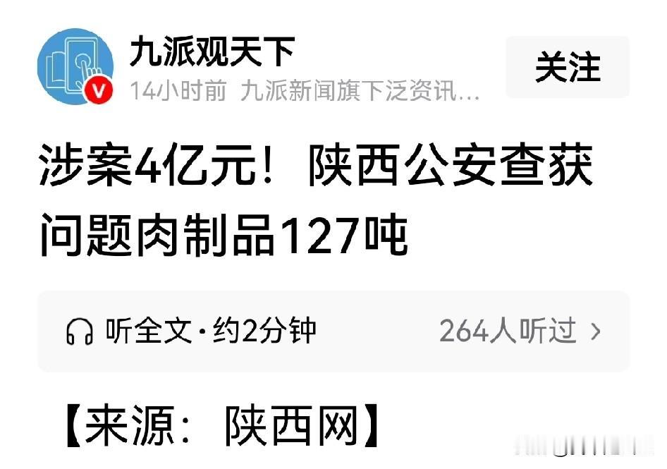 陕西严厉打击查获问题肉制品127吨,涉案价值4亿元。什么是肉制品你知道都包括哪些吗? 肉制品是以畜禽肉为主要原料,制作的熟肉制成品或半成品,包括:香肠、火腿、培根、酱卤肉、烧烤肉、肉干、肉脯、肉丸、调理肉串、肉饼、腌腊肉、水晶肉等等。包含的品类是不是挺多! 食品安全一直是大家非常关心的话题,无论是从源头还是销售渠道,本次陕西举办的发布会,通报了今年以来的打击行动成果。 据介绍,前11个月,共查获问题肉制品127吨,金额4亿元,肉制品刑事案件224起,抓了245人。是不是有点触目惊心! “民以食为天”,但部分商家却是“以利为天”,昧着良心追求利益,把食品安全抛之脑后,置人民健康于不顾。这种商家就应该受到严厉打击,还市场一个清净!还人民一个健康! 也警示那些企图昧良心的商家,不要挑战国家和人民对食品安全的决心! 食品安全 伪劣食品 掺假肉 合成假牛肉 假冒猪肉 肉制品检测 猪肉掺假 肉类掺假