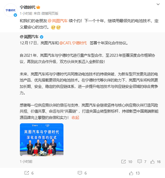 岚图汽车与宁德时代签署十年深化合作协议 据官微消息,12月17日,岚图汽车和签署十年深化合作协议。官方表示,自2021年,岚图汽车与宁德时代进行量产车型合作,至2023年签署深度合作框架协议,再到此次合作升级,双方伙伴关系迈入全新阶段!未来,岚图汽车将与宁德时代共同推动电池技术的持续突破,为新车型开发更先进的电池产品,优先搭载更领先的电池技术。在宁德时代等伙伴的助力下,岚图汽车将构筑更加长期、安全、稳定的供应链体系,进一步提升电池技术与供应链安全领域的综合竞争力。