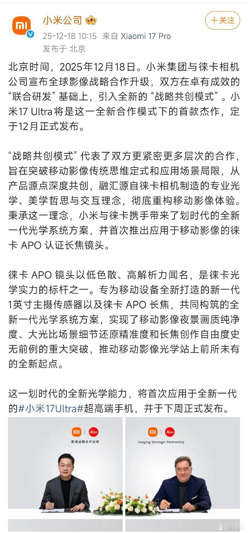 小米17Ultra发布时间定档,这也是小米首款搭载第五代骁龙8至尊芯片的影像超大杯旗舰。小米与徕卡战略合作升级后的首款机型,它带来了堪称“26年唯一”的划时代光学系统方案——1英寸主摄+2亿像素徕卡APO认证长焦,直接拉高影像机皇的门槛。友商喊着“大底+长焦”的不少,但真正把这一配置落地并做到极致的,目前只有小米。此前小米17 Pro上的lofic影像表现已足够惊艳,这次1英寸主摄加持下的lofic技术,在大光比场景(比如逆光、夜景)的画质突破更是让人期待,更关键的是,不做“大底和长焦”的选择题,也不牺牲中间焦段画质,传闻中的连续光变若能实装,将成为长焦的终极解决方案,让小米17Ultra在影像上直接就是跨代优势,下周的发布值得蹲守!