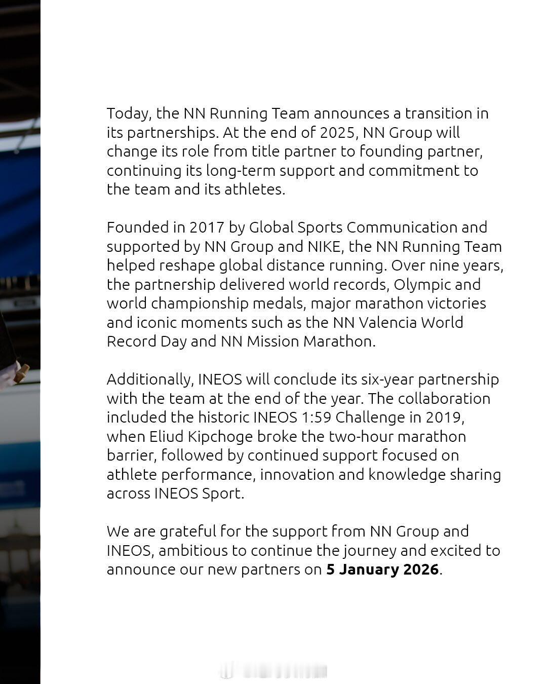 NN Running Team 将迎来建立以来最大变动:NN将不再是这个田径俱乐部的冠名赞助商,而退居创始赞助商的位置。回顾双方合作历程,最值得骄傲的当属 INEOS159 项目。今年,先是队伍王牌选手基普乔格宣布结束其职业选手身份的世界马拉松大满贯赛程;接着,队伍宣布了和高驰COROS的合作结束。新的队名会在2026年1月5日宣布。NNRunningTeam 基普乔格
