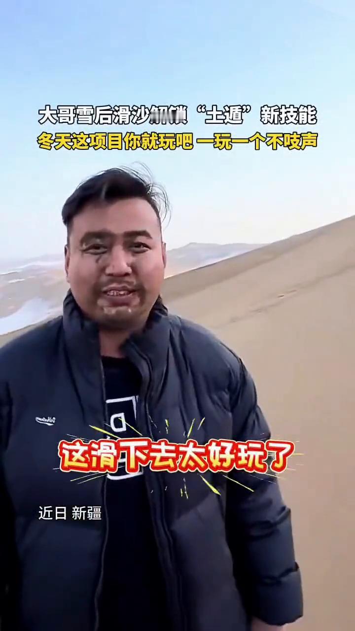 大哥雪后滑沙解锁"土遁"新技能,冬天这项目你就玩吧,一玩一个不吱声。 近日新疆,这滑下去太好玩了,超级好玩。放!走!