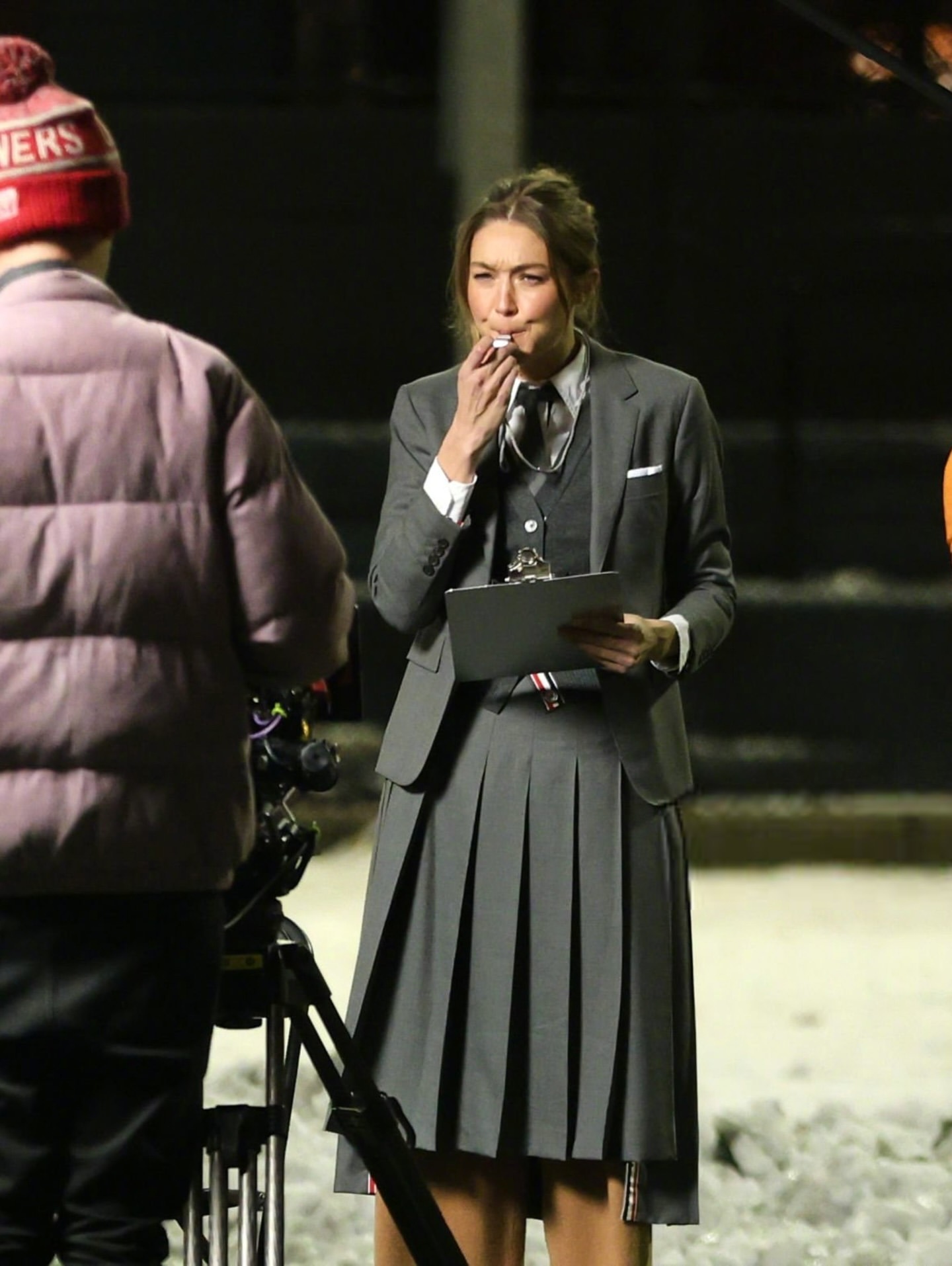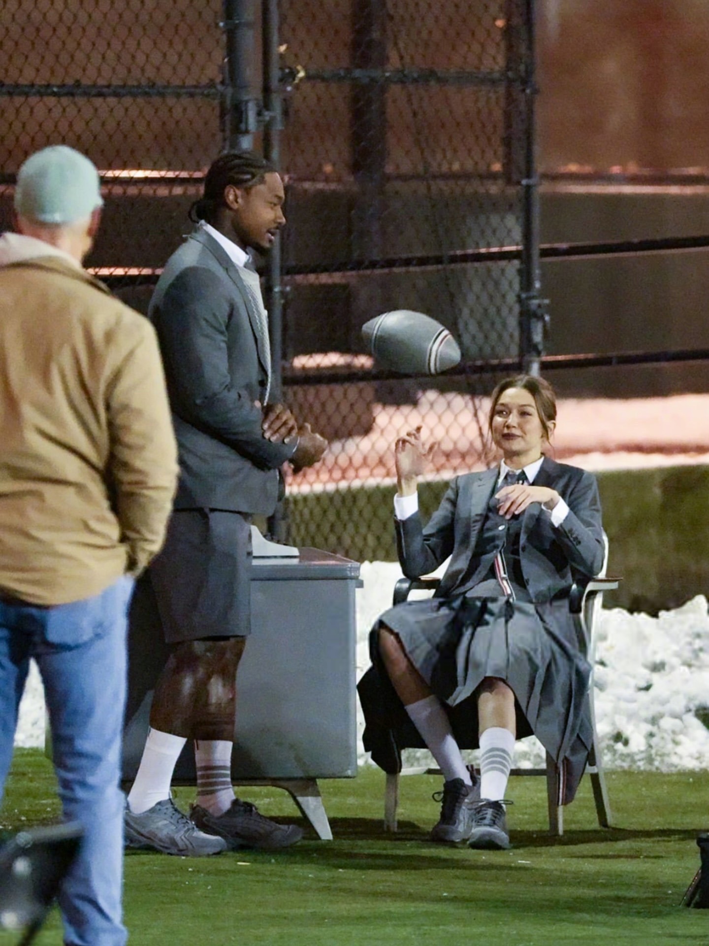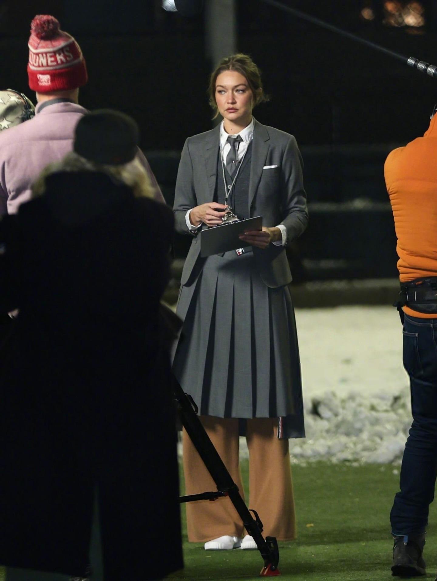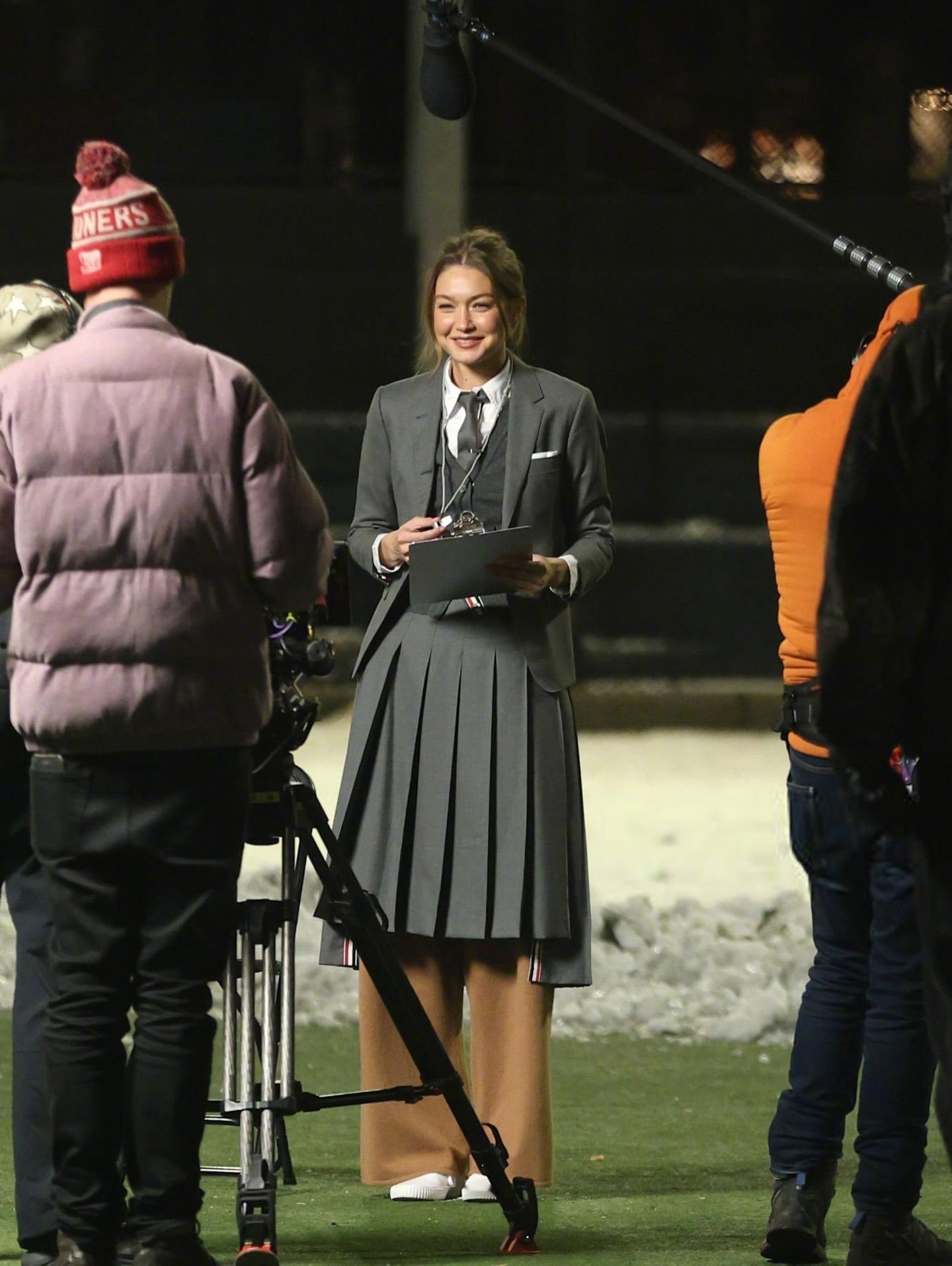 昨天,Gigi Hadid 现身纽约为 GQ Bowl x Thom Browne 拍摄广告大片。刚下过大雪❄️的纽约,冻得脸都红了!