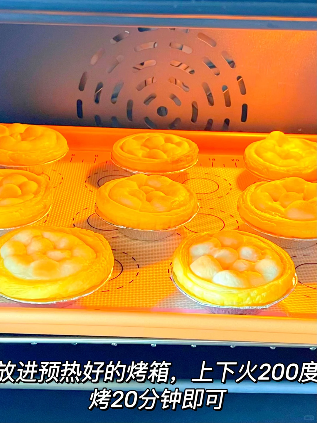 🌻烤箱必须提前预热充分,200度烤20分钟,时间过长会导致蛋挞液变干发柴,过短则无法凝固;