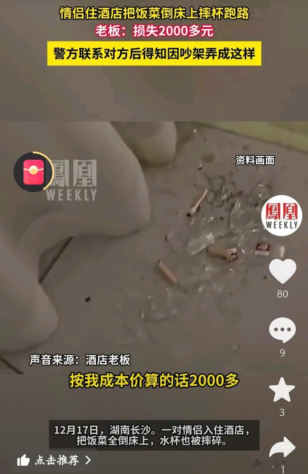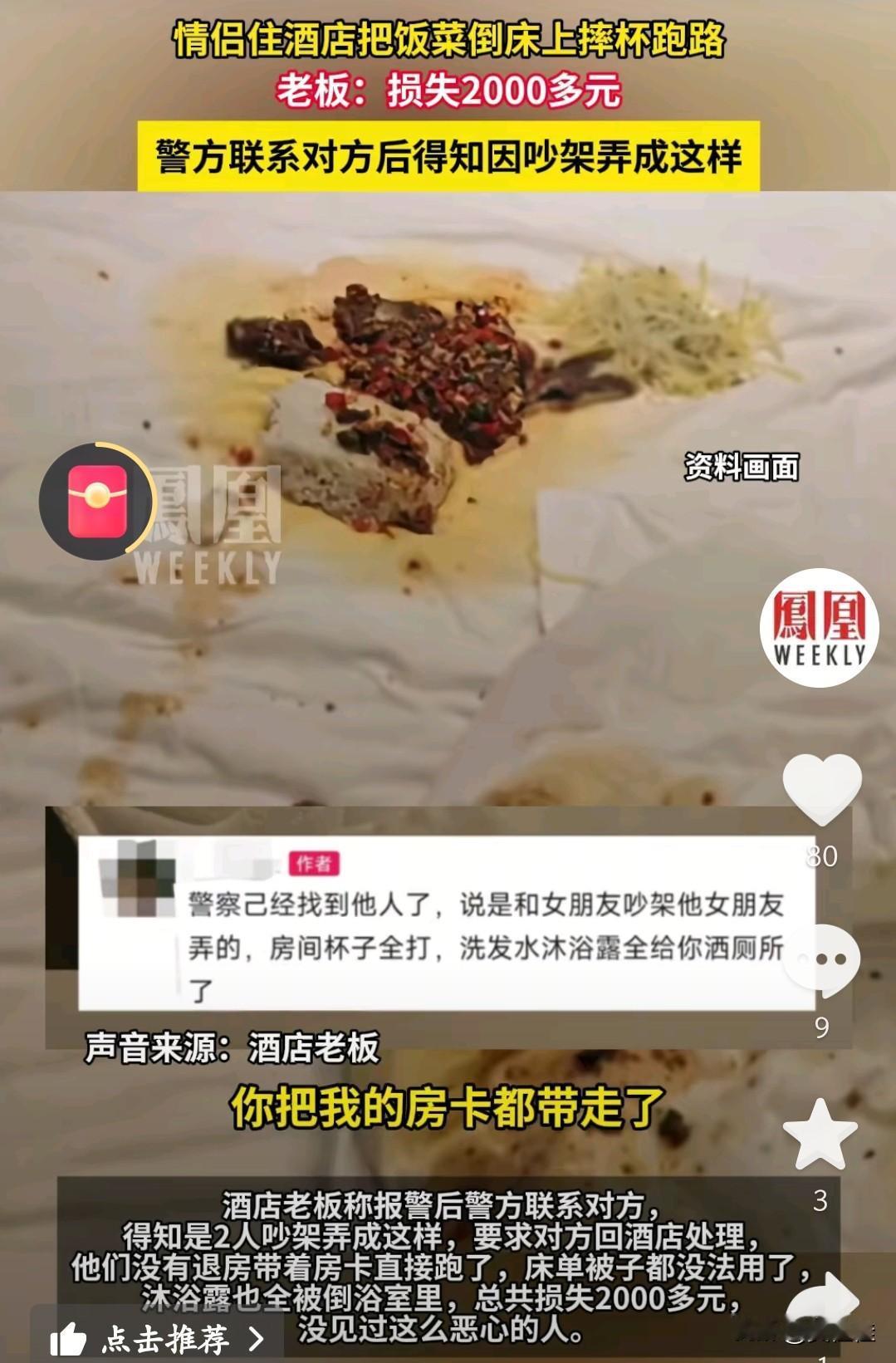 我看你俩还是乘早分了好,若是结婚,往后吵架就是掀桌子摔碗,买家具的速度都赶不上你俩吵架的速度。情侣吵架拿酒店撒气,把饭菜倒床上、摔碎水杯,连沐浴露都倒厕所,还带着房卡跑路,让老板损失两千多。 就因为俩人拌嘴,就糟践别人的东西,这不仅是没素质,更是没担当。谈恋爱是磨合不是互撕,连情绪都控制不住,还拿公共财物撒气,真结了婚日子还过不过? 酒店招谁惹谁了,平白蒙受损失。这种遇事只会迁怒他人的人,就算凑活在一起,往后的日子也只会鸡飞狗跳,趁早散了对谁都好。