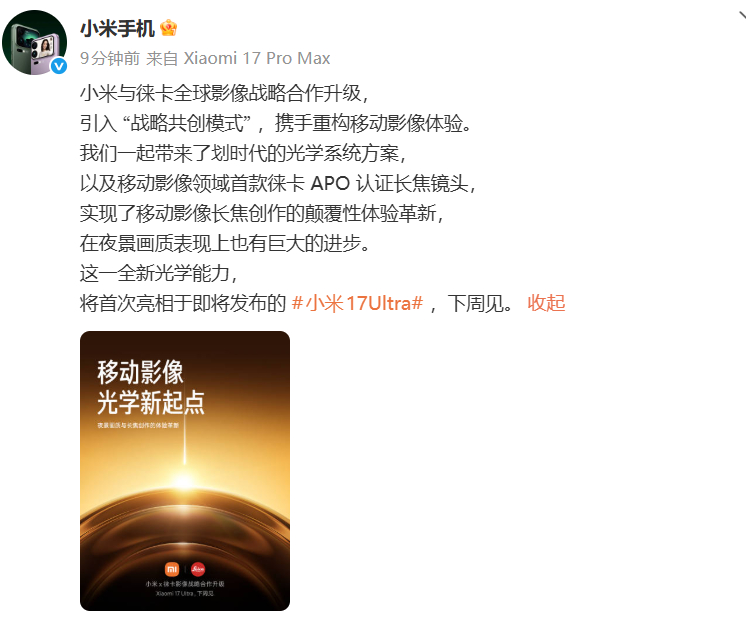 小米17Ultra发布时间定档 今年的小米17 Ultra来的很快,12月份下周就要发布了!小米的宣传是小米与徕卡全球影像战略合作升级,并且带来移动影像领域首款徕卡 APO 认证长焦镜头,宣称将实现了移动影像长焦创作的颠覆性体验革新。