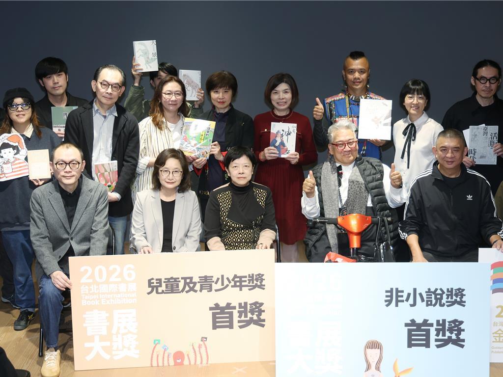 台北书展基金会18日公布“2026台北国际书展书展大奖暨金蝶奖”,台北书展基金会董事长郝明义(前排右二)、文化部人文及出版司副司长朱砡莹(前排中)与各奖项得主合影。