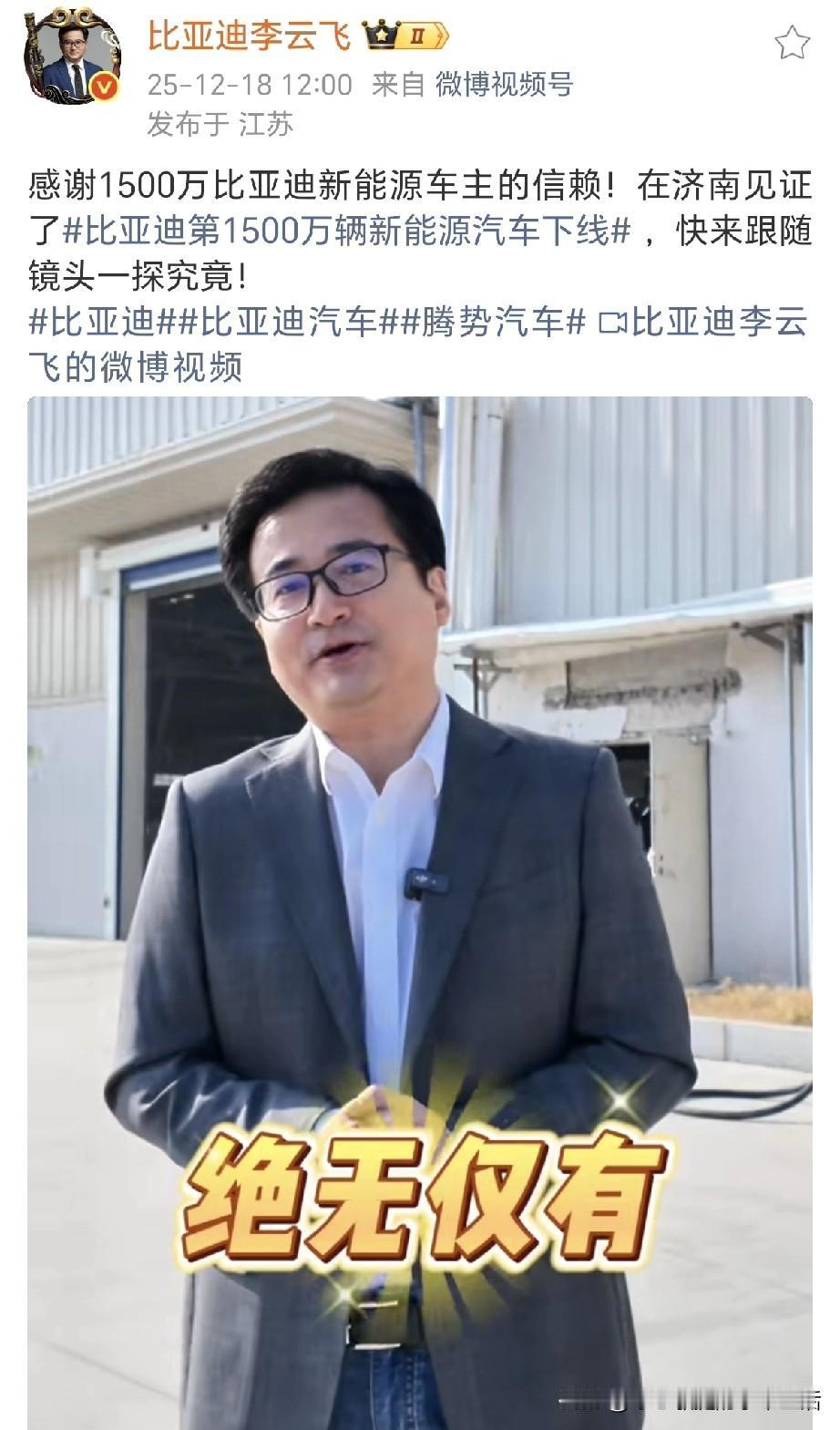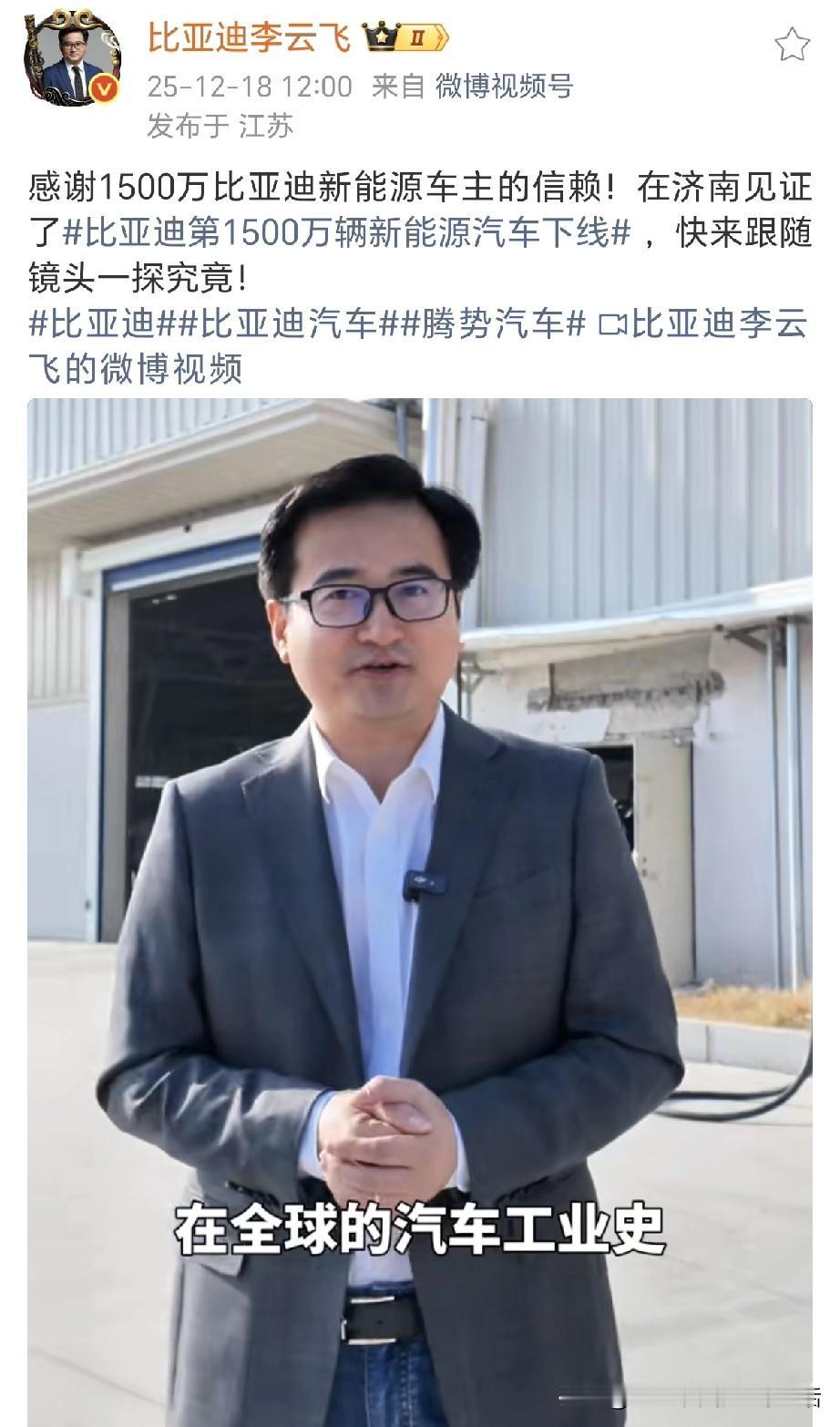 比亚迪李云飞:这速度,在全球的汽车工业史上都是绝无仅有的。 2023年8月比亚迪第500万辆新能源汽车下线,罗振宇 成为第500万辆车主! 2024年11月比亚迪第1000万辆新能源汽车下线,成为首家达成这一里程碑的车企。游戏科学创始人兼CEO冯骥喜提腾势Z9,成为比亚迪第1000万辆新能源汽车车主。 2025年12月比亚迪第1500万辆新能源汽车下线,第1500万台新能源汽车的主角腾势N8L。 自2008年比亚迪第一辆新能源汽车上市以来,从1~100万辆,比亚迪用了13年! 从500万到1000万,再到1500万台,只用了短短的两年时间!比亚迪李云飞表示这样的发展速度呢,在全球的汽车工业史上都是绝无仅有的。 两年前还在庆祝500万,如今已经突破1500万辆!这速度真的让人佩服。其实冷静下来思考,1500万辆,能卖这么多,是经过了市场考验,是多年的技术积累、是稳定的品质、是口口相传的口碑!在新能源赛道上,比亚迪用技术和硬实力跑出了中国速度!为比亚迪点赞!