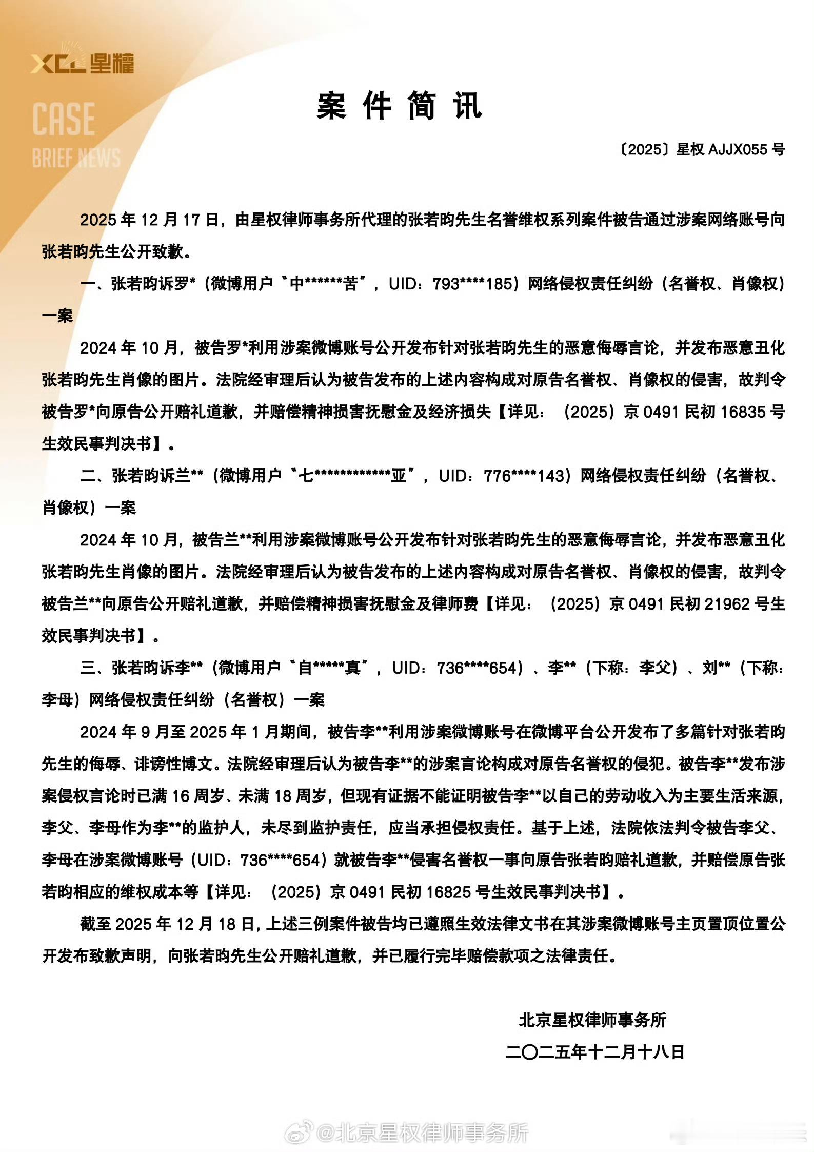 张若昀名誉维权案进展张若昀多起告黑胜诉张若昀三起告黑维权胜诉 张若昀名誉维权案最新进展来了,多起被告败诉,需要向张若昀方道歉,终于得见曙光,网络不应该是恶语污蔑的集散地,每个人都不能无视法律的尊严,真相总有一天会到来!