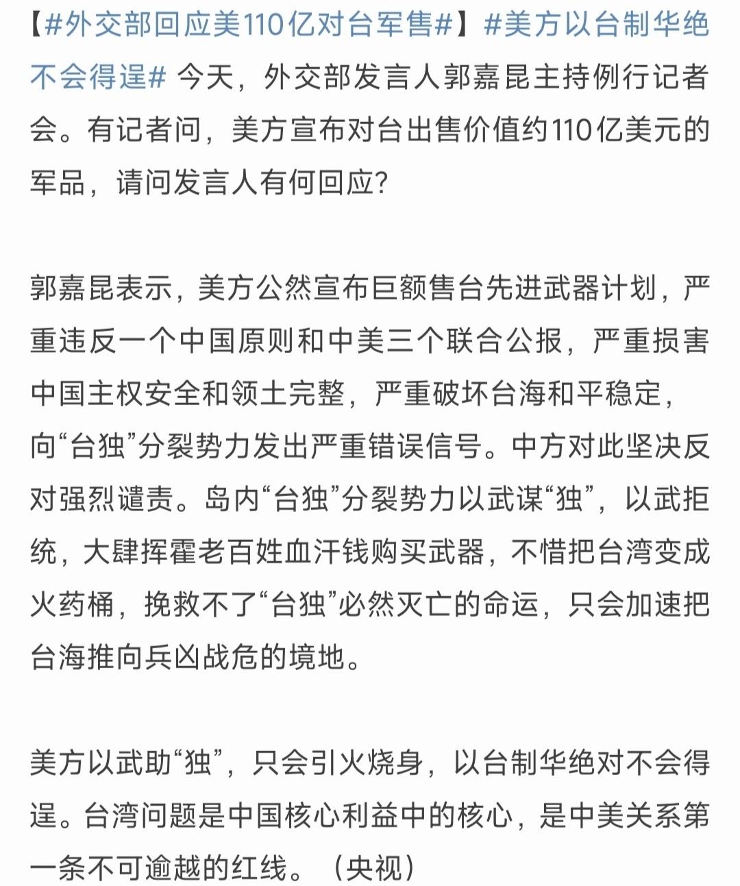 美方启动111亿美元对台军售,中方强烈谴责,岛内曝出内幕:美国人强买强卖 18日,美方宣布,启动一项总价超过111亿美元(约3500亿元新台币)的对台军售案,包括60辆M109A7自行火炮、82辆“海马斯”火箭弹发射车、420枚ATACMS陆军战术导弹,以及“标枪”反坦克导弹系统、“陶”氏反坦克导弹系统、“阿尔提乌斯”无人机系统、AH-1W“超级眼镜蛇”直升机备件,还有“鱼叉”反舰导弹的售后服务等,整个军售案将在一个月后正式生效。 还有消息称,这些武器装备只是美对台军售的“开胃小菜”,后续,美方可能还要出售大批“爱国者-3”导弹、9个连的“国家先进地对空防空导弹系统”(NASAMS)等等。可以说,这一次,美方计划出售的武器装备,规模之庞大也是相当罕见了。 对此,国台办、外交部都在第一时间做出了回应,对美方的做法进行了强烈谴责,敦促美方恪守一个中国原则,停止向“台独”分子发出错误信号。外交部回应美110亿美元对台军售 而有岛内媒体则曝出了一个惊天内幕:这次军售案共有8项,其中5项都需要动用赖清德前几天提出的“400亿美元(约1.25万亿元新台币)特别采购预算”。但问题是,这份预算还没有通过岛内立法机构批准,而且就算批准,也是一个长达8年的长期预算。 也就是说,美方在预算都还没有的时候就抢先宣布军售案,是在强买强卖;公布军售案,却不承诺装备何时到位,很可能就是想赖账,无异于直接抢劫。但岛内也不敢忤逆美方,所以只能捏着鼻子认下,尽快给美国人付款。 有岛内民众就猜测,这次美国人如此急着抢劫台岛,恐怕就是认定,大陆或许将很快动手”武统”,所以,美国人必须趁着现在赶紧敲骨吸髓,榨干台岛的最后一分钱。这可能也能解释特朗普为何连明年的访华行程都不顾了,也要一股脑向太早卖出这么多东西,因为对于美方来说,过了这个村,或许就真的没有这个店了。