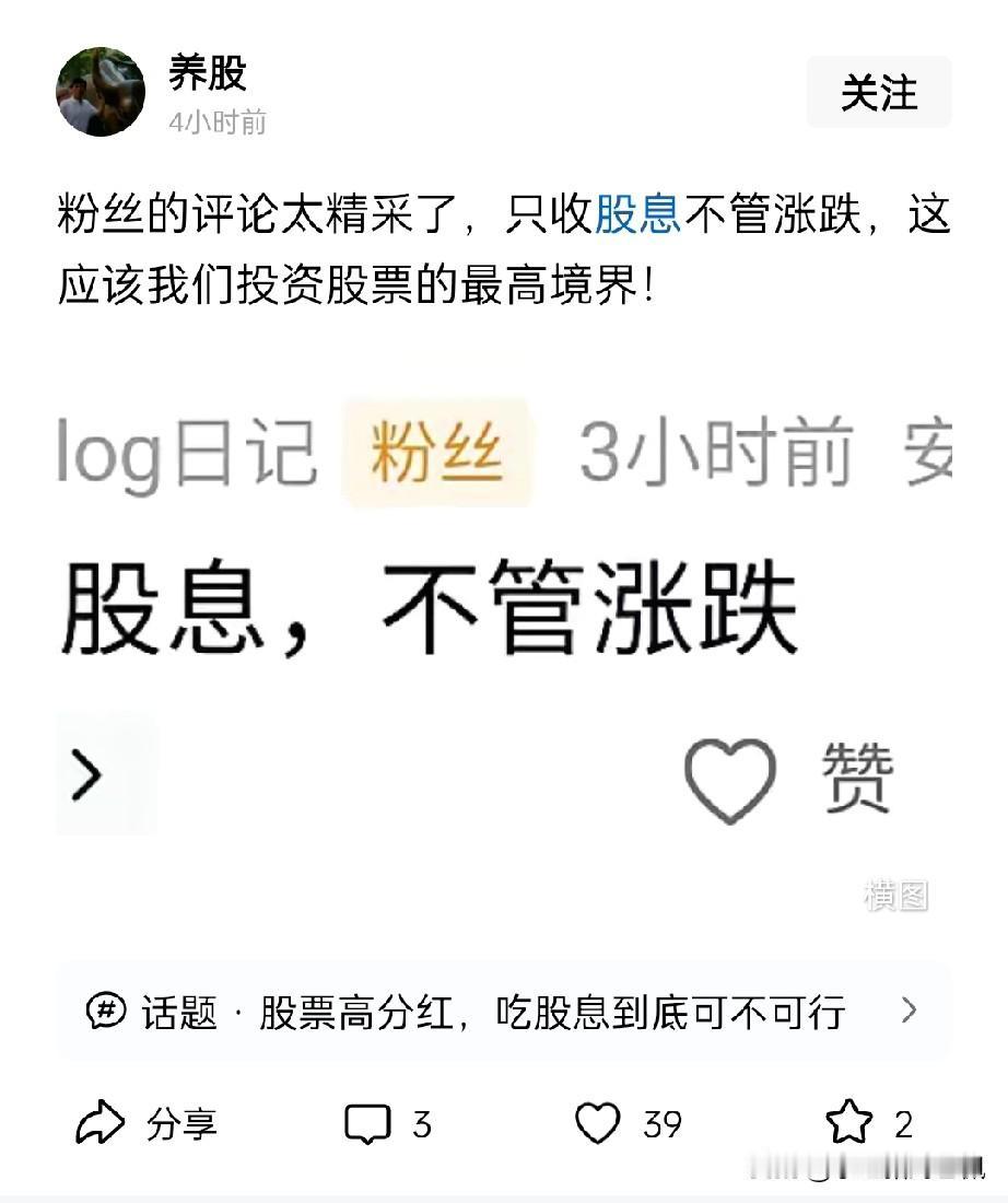 成天胡说八道,误导别人 投资者来资本市场的主要目的就是获取资本利得收入。你冒着权益市场的风险溢价,只获取固收市场的投资回报,显然不是一笔合算的买卖。 应该说股息只是股权投资多加了一道安全垫,也给投资者们多了一种选择,但如果来到权益市场完全冲着股息去,那你不如回到固收市场去! 别拿自己的没能力,和持仓都是银行股,去曲解市场和投资的本质!