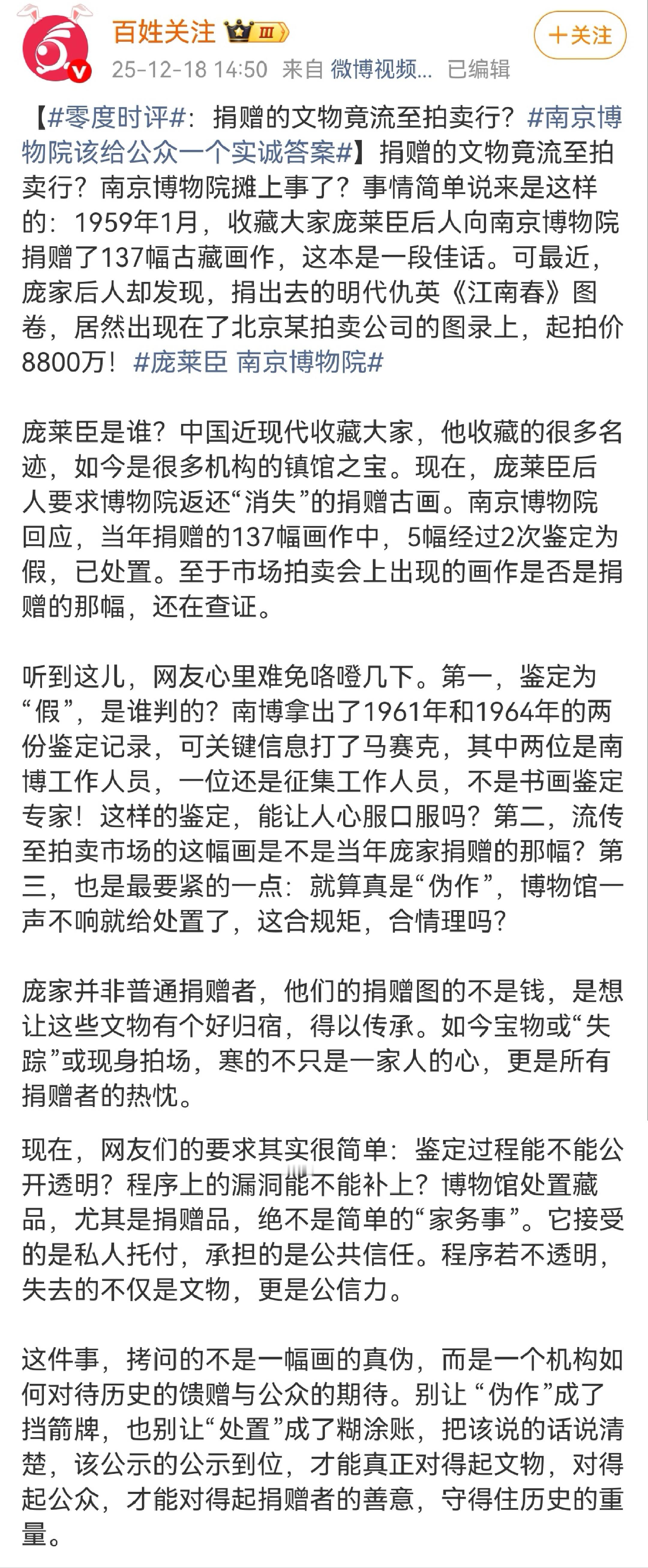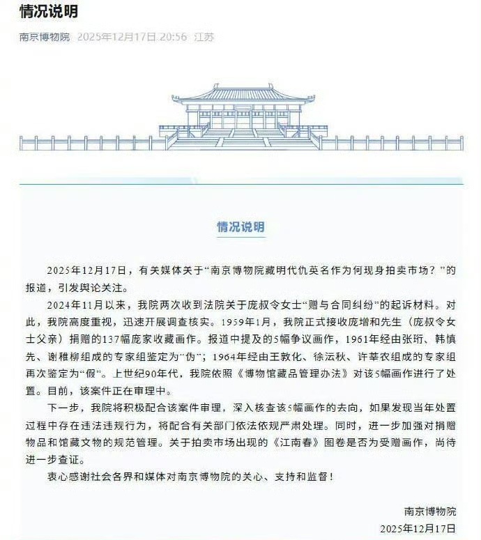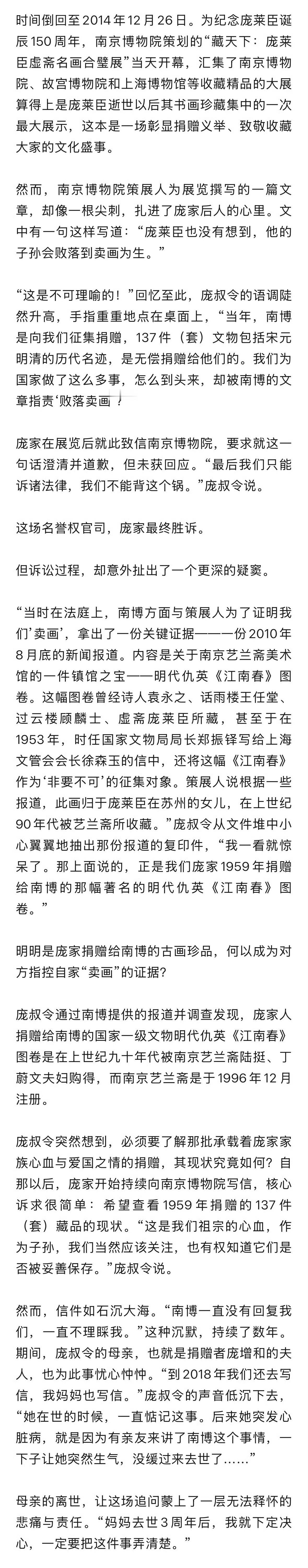 2014年12月26日,南京博物院举办“藏天下:庞莱臣虚斋名画合璧展”,该展览是为纪念庞莱臣诞辰150周年而策划,策展人、南博研究馆员庞鸥在展览文章中写道:“庞莱臣也没有想到,他的子孙会败落到卖画为生。”庞家后人认为,这是对家族名誉的严重侮辱,遂提起名誉权诉讼,要求澄清并道歉。南京博物院 江南春国家文物局调查博物馆藏画拍卖事件在法庭上,为了证明庞家“卖画”,南博方面提交了一份2010年的新闻报道,称明代仇英《江南春》图卷在1990年代由庞莱臣女儿卖给南京艺兰斋美术馆。庞家后人当场震惊,因为该画正是他们1959年无偿捐赠给南博的藏品之一。由此,庞家后人质疑:捐给国家的文物为何出现在拍卖市场?南博不仅未妥善保管捐赠品,反而用其作为“卖画”证据,反咬捐赠人“败落”,实属颠倒黑白。此后,庞家持续通过法律途径维权,要求南博公开藏品去向并追责,最终庞家胜诉,法院判决庞鸥赔礼道歉。没想到,十几年后的2025年5月,庞家后人发现,捐出去的明代仇英《江南春》图卷,居然又出现在了北京某拍卖公司的图录上,起拍价8800万。庞家随即举报,国家文物部门介入,拍品被撤拍;12月16日,庞家后人庞叔令正式向法院递交《强制执行申请书》,要求南博交出该画66年来的全部流转记录。12月17日,南京博物院发布“情况说明”,称已启动内部调查,目前尚不能确认拍卖图录所示《江南春图》就是本馆1959年受捐藏品。个人质疑的是,南博鉴定的庞家后人捐赠137幅画作的“伪”“假”作品,为何不与庞家后人沟通?居然可以私自处置5幅“伪”画?还不清楚具体去向。66年后,还是那副明代仇英《江南春》图卷,出现在北京某拍卖公司的图录,如果确定是被南京博物馆内部鉴定为“伪作”而悄悄“处理”掉的同一副《江南春》,那真是讽刺拉满。至于2010年所谓的明代仇英《江南春》图卷“由庞莱臣在苏州的女儿于上世纪90年代转让给艺兰斋”的新闻报道,目前看不到任何买卖合同、付款记录或官方批复能佐证,大概率属于假新闻。南京博物院 江南春