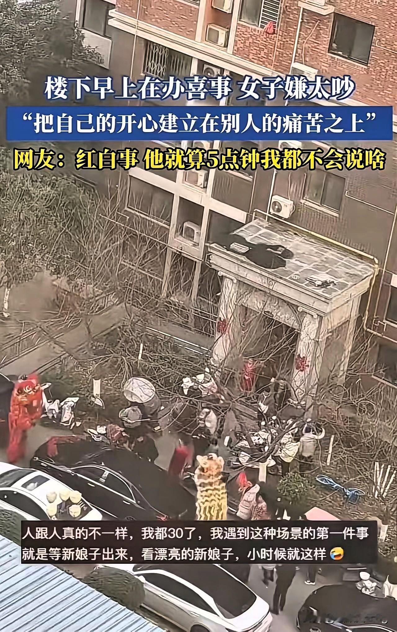 “办喜事吵到我睡觉!女子怒斥邻居缺德,评论区却一边倒!” 大清早楼下办喜事敲锣打鼓,本是图个热闹吉利,却惹得晚睡晚起的女子拍视频吐槽,说邻居把快乐建立在别人的痛苦之上。 她本以为能收获网友声援,没想到大家全在怼她矫情。办喜事一辈子没几次,热闹也就一个早上,邻里之间这点包容都没有,未免太斤斤计较。说到底,住一个小区就是低头不见抬头见,多换位思考,少揪着小事较劲,日子才能更舒心。 总想着自己的舒服,却不顾别人的喜事,这样的相处模式,换谁都觉得别扭。 你遇到过邻里间的这类小摩擦吗?